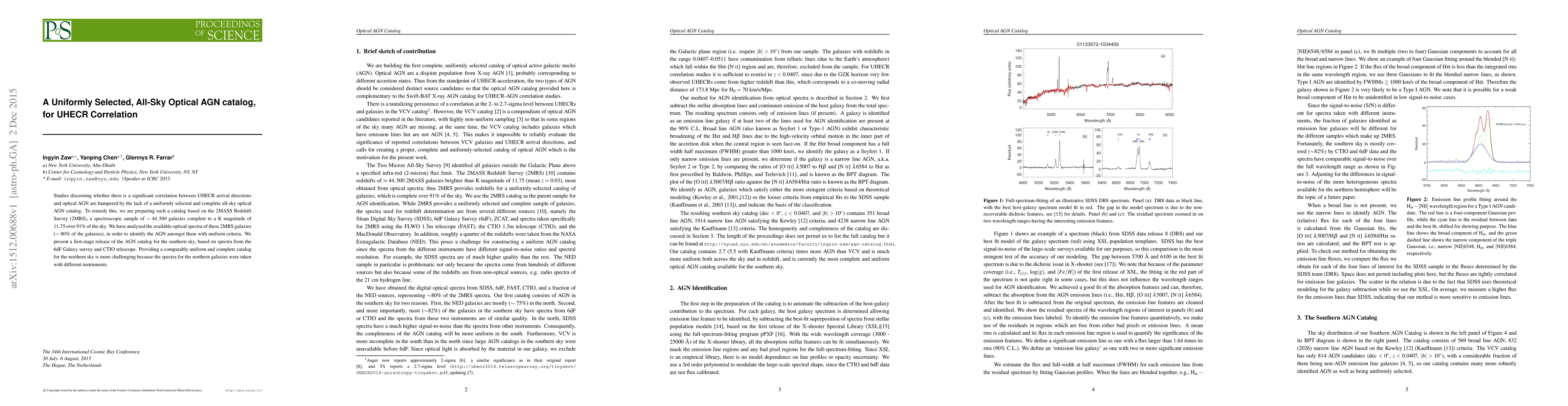 This paper presents a uniformly selected all-sky optical Active Galactic Nucleus (AGN) catalog derived from the 2MASS Redshift Survey, aiming to facilitate studies on correlations between UHECR arrival directions and AGN. The southern sky catalog is based on spectra from the 6dF Galaxy survey and CTIO telescope, while challenges remain for the northern sky due to varied instrumentation.