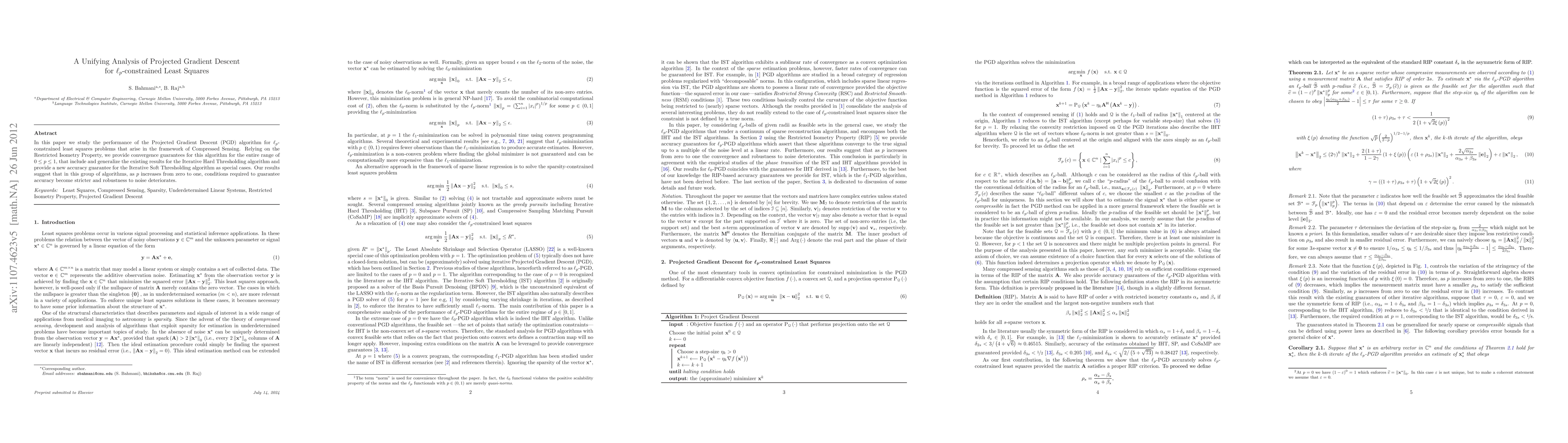 In this paper we study the performance of the Projected Gradient Descent(PGD) algorithm for $\ell_{p}$-constrained least squares problems that arise in the framework of Compressed Sensing. Relying on the Restricted Isometry Property, we provide convergence guarantees for this algorithm for the entire range of $0\leq p\leq1$, that include and generalize the existing results for the Iterative Hard Thresholding algorithm and provide a new accuracy guarantee for the Iterative Soft Thresholding algorithm as special cases. Our results suggest that in this group of algorithms, as $p$ increases from zero to one, conditions required to guarantee accuracy become stricter and robustness to noise deteriorates.