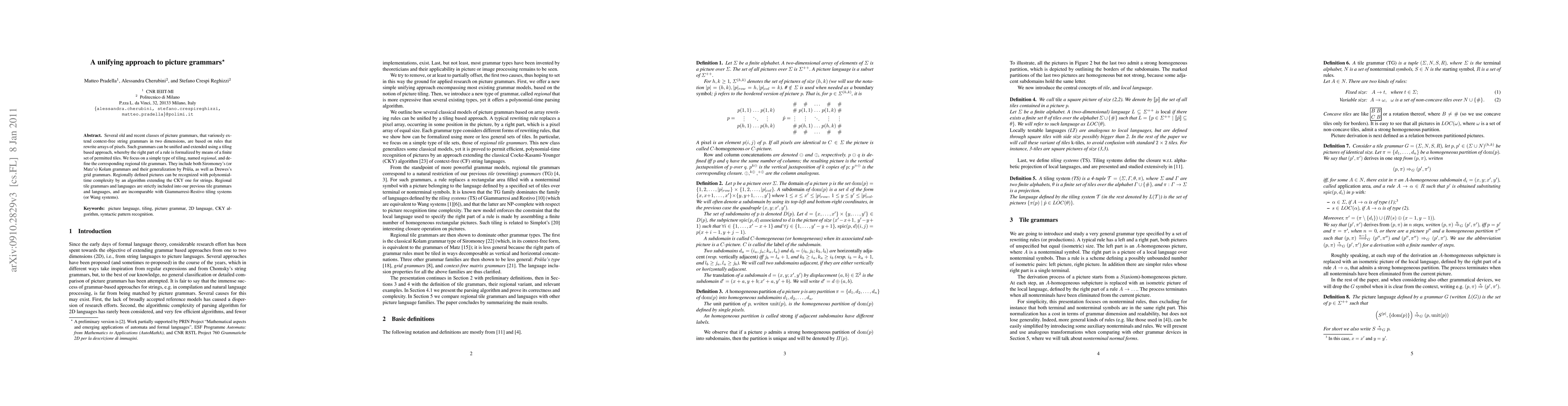 Several old and recent classes of picture grammars, that variously extend context-free string grammars in two dimensions, are based on rules that rewrite arrays of pixels. Such grammars can be unified and extended using a tiling based approach, whereby the right part of a rule is formalized by means of a finite set of permitted tiles. We focus on a simple type of tiling,named regional, and define the corresponding regional tile grammars. They include both Siromoney's (or Matz's) Kolam grammars and their generalization by Prusa, as well as Drewes's grid grammars. Regionally defined pictures can be recognized with polynomial-time complexity by an algorithm extending the CKY one for strings. Regional tile grammars and languages are strictly included into our previous tile grammars and languages, and are incomparable with Giammarresi-Restivo tiling systems (or Wang systems).