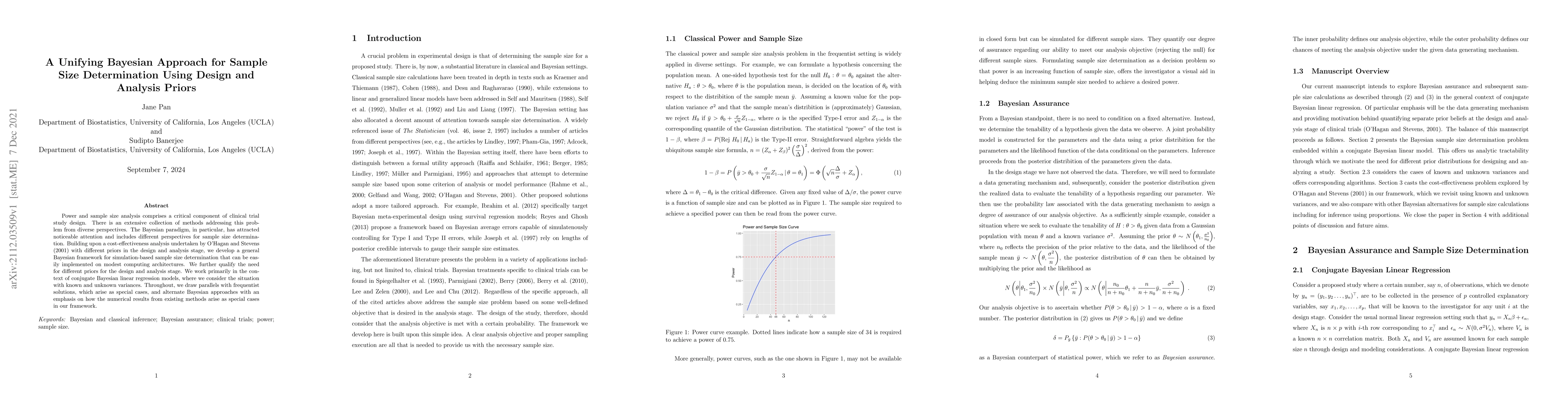 Power and sample size analysis comprises a critical component of clinical trial study design. There is an extensive collection of methods addressing this problem from diverse perspectives. The Bayesian paradigm, in particular, has attracted noticeable attention and includes different perspectives for sample size determination. Building upon a cost-effectiveness analysis undertaken by O'Hagan and Stevens (2001) with different priors in the design and analysis stage, we develop a general Bayesian framework for simulation-based sample size determination that can be easily implemented on modest computing architectures. We further qualify the need for different priors for the design and analysis stage. We work primarily in the context of conjugate Bayesian linear regression models, where we consider the situation with known and unknown variances. Throughout, we draw parallels with frequentist solutions, which arise as special cases, and alternate Bayesian approaches with an emphasis on how the numerical results from existing methods arise as special cases in our framework.