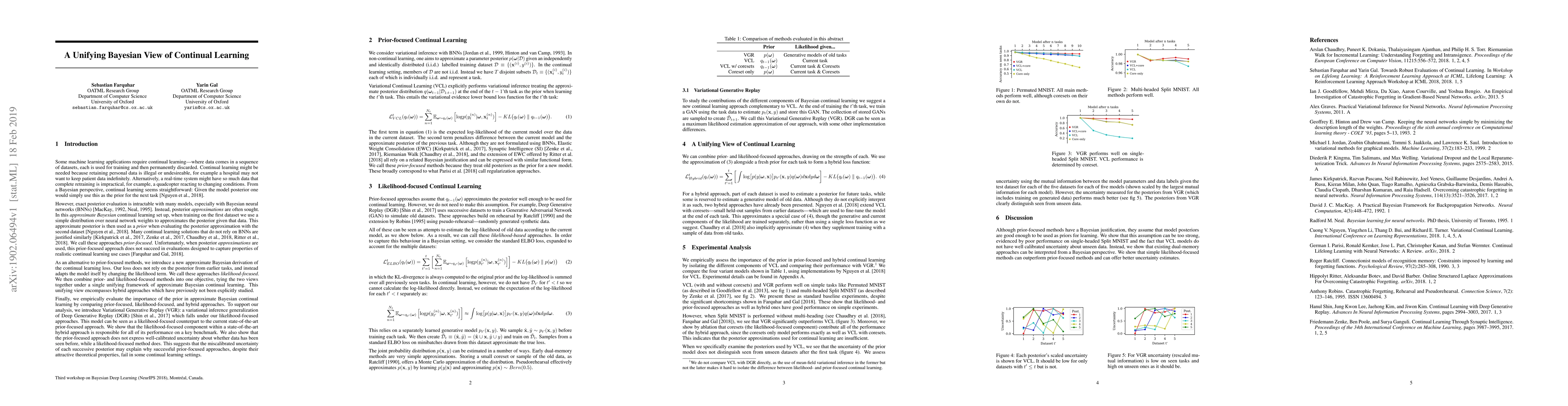 Some machine learning applications require continual learning - where data comes in a sequence of datasets, each is used for training and then permanently discarded. From a Bayesian perspective, continual learning seems straightforward: Given the model posterior one would simply use this as the prior for the next task. However, exact posterior evaluation is intractable with many models, especially with Bayesian neural networks (BNNs). Instead, posterior approximations are often sought. Unfortunately, when posterior approximations are used, prior-focused approaches do not succeed in evaluations designed to capture properties of realistic continual learning use cases. As an alternative to prior-focused methods, we introduce a new approximate Bayesian derivation of the continual learning loss. Our loss does not rely on the posterior from earlier tasks, and instead adapts the model itself by changing the likelihood term. We call these approaches likelihood-focused. We then combine prior- and likelihood-focused methods into one objective, tying the two views together under a single unifying framework of approximate Bayesian continual learning.