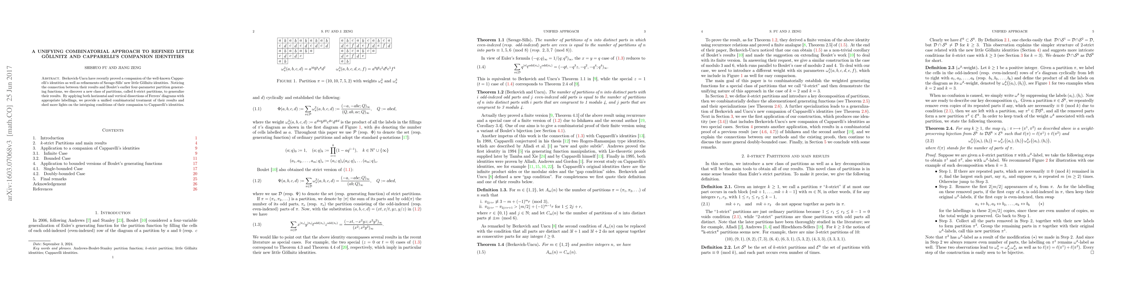 Berkovich-Uncu have recently proved a companion of the well-known Capparelli's identities as well as refinements of Savage-Sills' new little G\"ollnitz identities. Noticing the connection between their results and Boulet's earlier four-parameter partition generating functions, we discover a new class of partitions, called $k$-strict partitions, to generalize their results. By applying both horizontal and vertical dissections of Ferrers' diagrams with appropriate labellings, we provide a unified combinatorial treatment of their results and shed more lights on the intriguing conditions of their companion to Capparelli's identities.