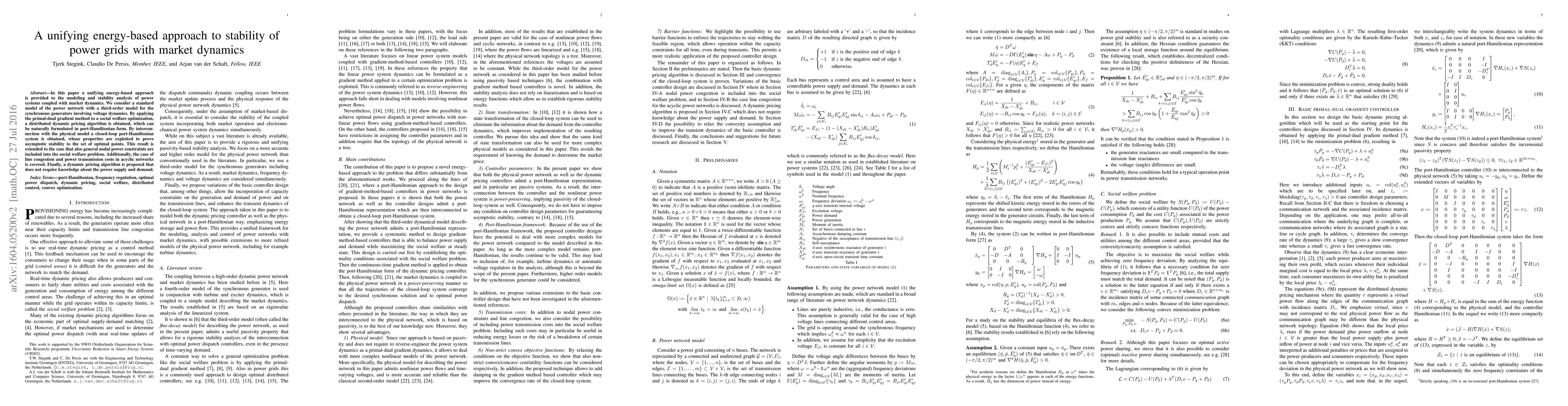 In this paper a unifying energy-based approach is provided to the modeling and stability analysis of power systems coupled with market dynamics. We consider a standard model of the power network with a third-order model for the synchronous generators involving voltage dynamics. By applying the primal-dual gradient method to a social welfare optimization, a distributed dynamic pricing algorithm is obtained, which can be naturally formulated in port-Hamiltonian form. By interconnection with the physical model a closed-loop port-Hamiltonian system is obtained, whose properties are exploited to prove asymptotic stability to the set of optimal points. This result is extended to the case that also general nodal power constraints are included into the social welfare problem. Additionally, the case of line congestion and power transmission costs in acyclic networks is covered. Finally, a dynamic pricing algorithm is proposed that does not require knowledge about the power supply and demand.