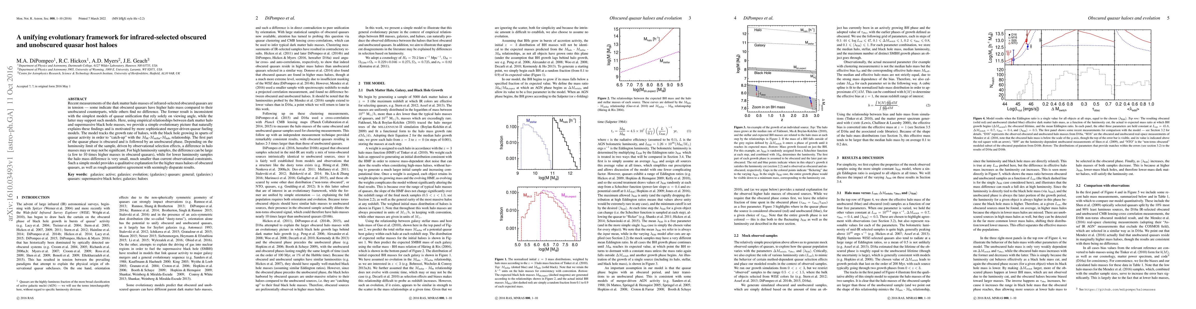 This paper proposes an evolutionary framework explaining the differing dark matter halo masses of infrared-selected obscured and unobscured quasars, suggesting that obscured quasars may have higher halo masses due to their growth spurts. The model accounts for observational selection effects, explaining why high luminosity samples show significant halo mass differences while lower luminosity ones do not.