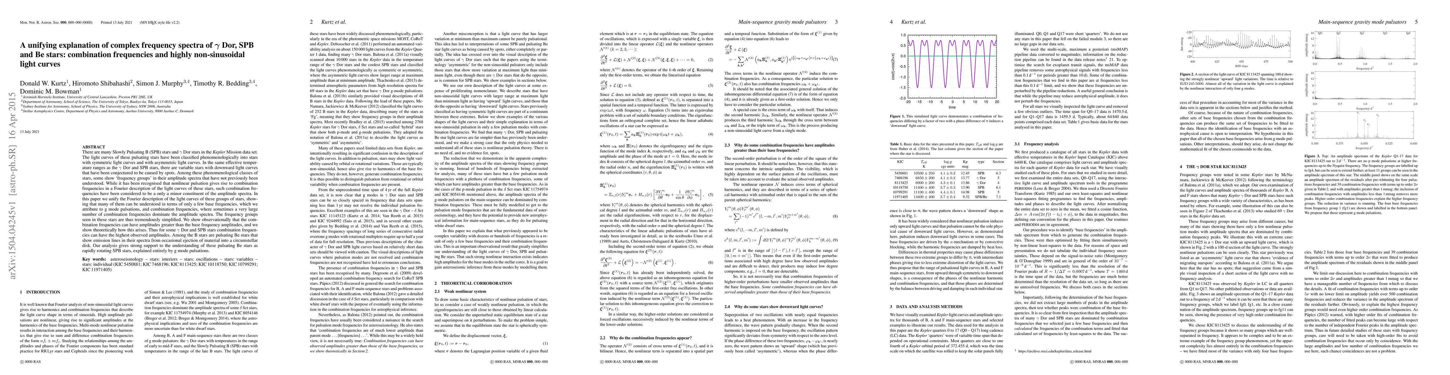 There are many Slowly Pulsating B (SPB) stars and gamma Dor stars in the Kepler Mission data set. The light curves of these pulsating stars have been classified phenomenologically into stars with symmetric light curves and with asymmetric light curves. In the same effective temperature ranges as the gamma Dor and SPB stars, there are variable stars with downward light curves that have been conjectured to be caused by spots. Among these phenomenological classes of stars, some show `frequency groups' in their amplitude spectra that have not previously been understood. While it has been recognised that nonlinear pulsation gives rise to combination frequencies in a Fourier description of the light curves of these stars, such combination frequencies have been considered to be a only a minor constituent of the amplitude spectra. In this paper we unify the Fourier description of the light curves of these groups of stars, showing that many of them can be understood in terms of only a few base frequencies, which we attribute to g mode pulsations, and combination frequencies, where sometimes a very large number of combination frequencies dominate the amplitude spectra. The frequency groups seen in these stars are thus tremendously simplified. We show observationally that the combination frequencies can have amplitudes greater than the base frequency amplitudes, and we show theoretically how this arises. Thus for some gamma Dor and SPB stars combination frequencies can have the highest observed amplitudes. Among the B stars are pulsating Be stars that show emission lines in their spectra from occasional ejection of material into a circumstellar disk. Our analysis gives strong support to the understanding of these pulsating Be stars as rapidly rotating SPB stars, explained entirely by g mode pulsations.