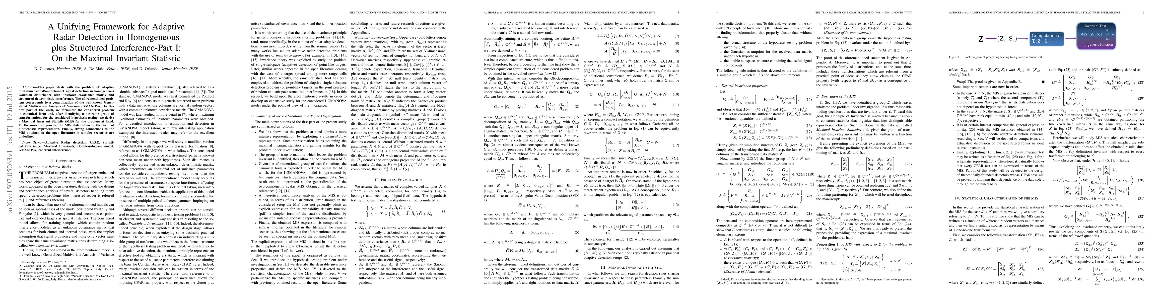 This paper deals with the problem of adaptive multidimensional/multichannel signal detection in homogeneous Gaussian disturbance with unknown covariance matrix and structured deterministic interference. The aforementioned problem corresponds to a generalization of the well-known Generalized Multivariate Analysis of Variance (GMANOVA). In this first part of the work, we formulate the considered problem in canonical form and, after identifying a desirable group of transformations for the considered hypothesis testing, we derive a Maximal Invariant Statistic (MIS) for the problem at hand. Furthermore, we provide the MIS distribution in the form of a stochastic representation. Finally, strong connections to the MIS obtained in the open literature in simpler scenarios are underlined.