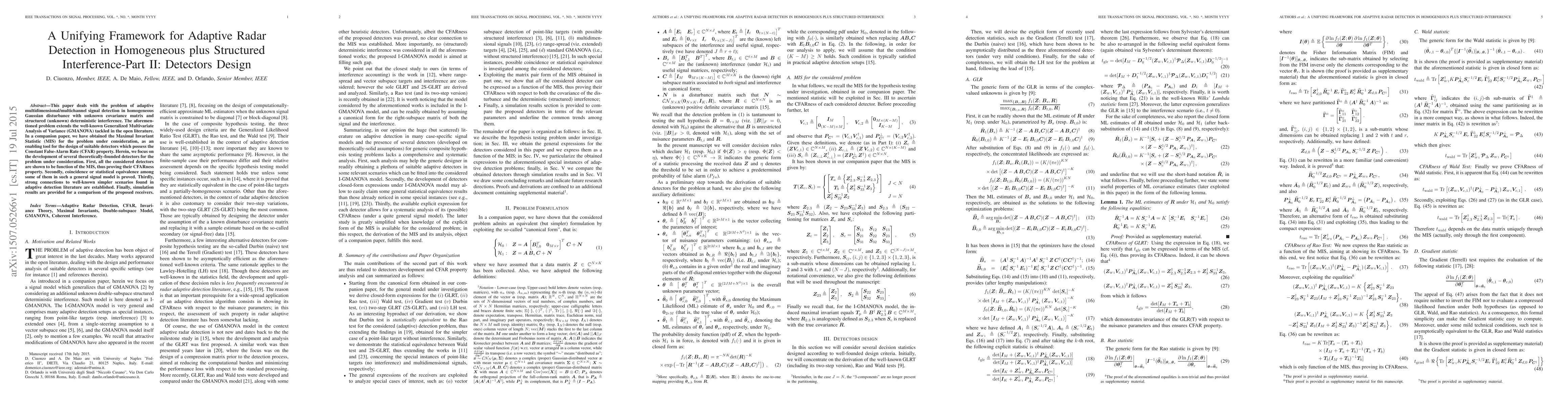 Researchers developed a framework for adaptive radar detection in the presence of structured interference, using a unifying approach that combines theoretical foundations with simulation results. The new detectors designed can detect signals in homogeneous Gaussian disturbance with unknown covariance matrix and structured deterministic interference.