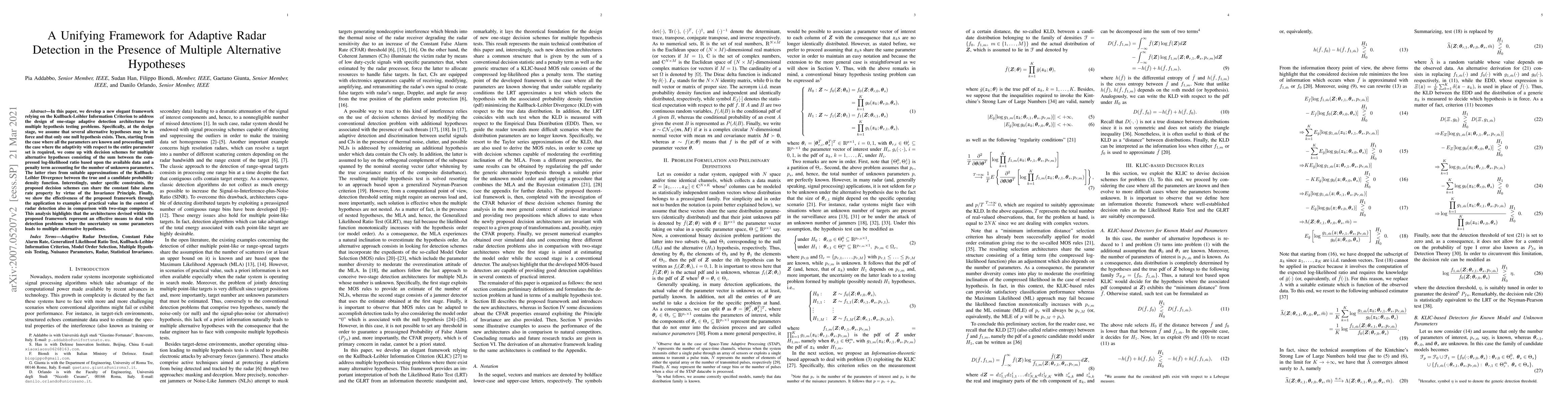 This paper introduces a new adaptive radar detection framework using the Kullback-Leibler Information Criterion for multiple hypothesis testing, providing decision schemes that balance likelihood ratios and penalties for unknown parameters. The proposed method maintains constant false alarm rates under certain conditions and demonstrates effectiveness in practical radar detection scenarios.