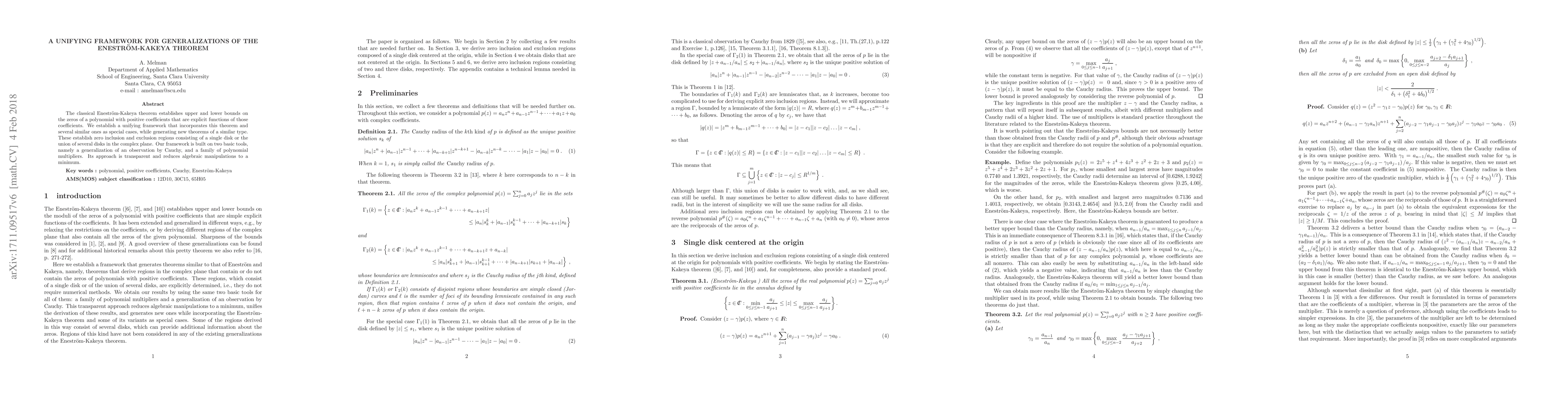 The classical Enestrom-Kakeya theorem establishes upper and lower bounds on the zeros of a polynomial with positive coefficients that are explicit functions of those coefficients. We establish a unifying framework that incorporates this theorem and several similar ones as special cases, while generating new theorems of a similar type. These establish zero inclusion and exclusion regions consisting of a single disk or the union of several disks in the complex plane. Our framework is built on two basic tools, namely a generalization of an observation by Cauchy, and a family of polynomial multipliers. Its approach is transparent and reduces algebraic manipulations to a minimum.