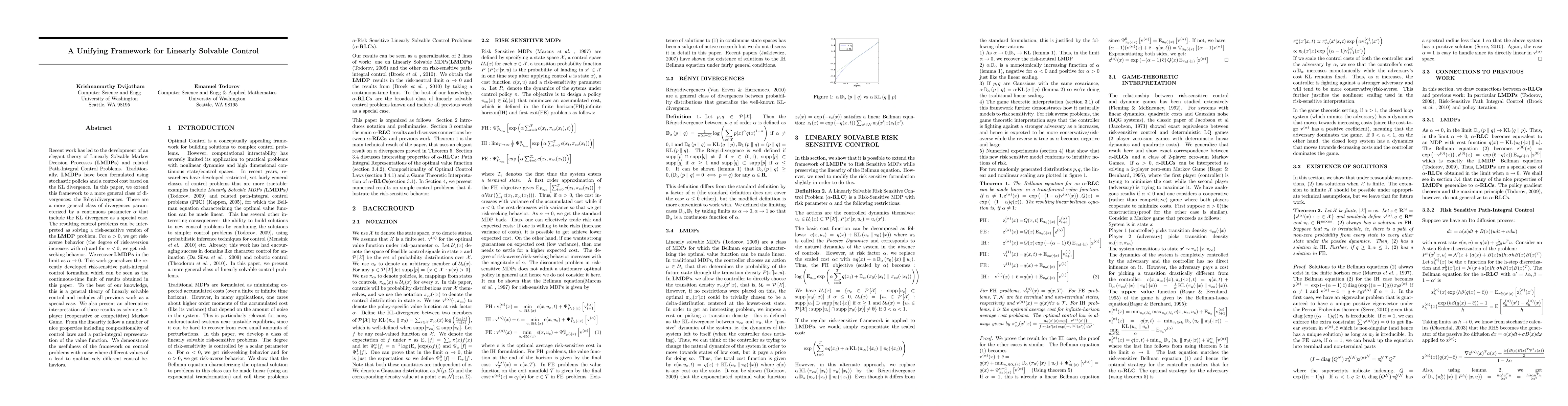 Researchers developed a unifying framework for linearly solvable control problems that incorporates Renyi divergences, providing risk-sensitive behavior and generalizing previous work on Linearly Solvable Markov Decision Processes.