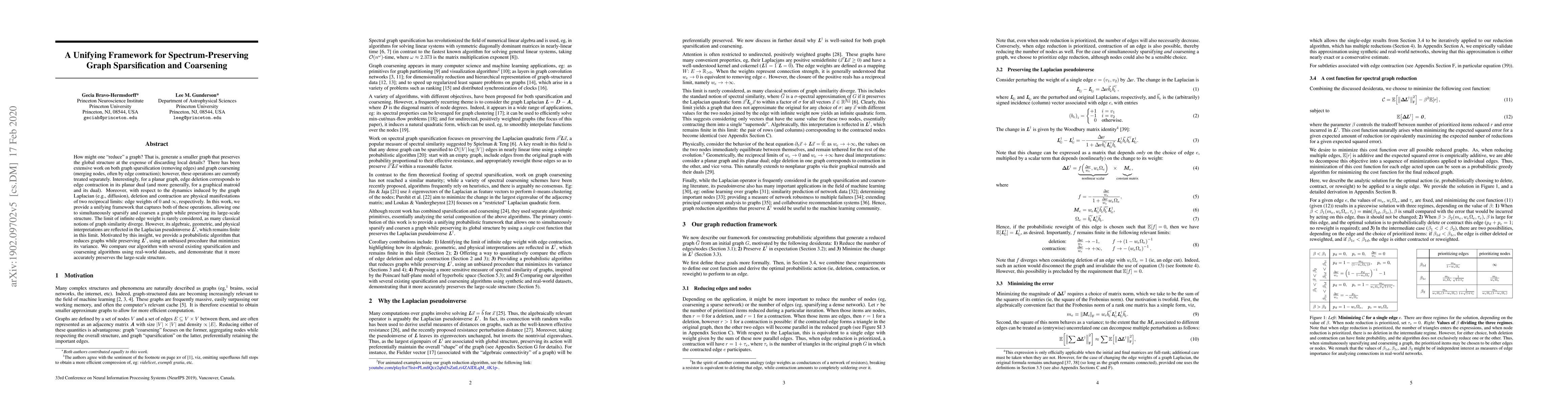 This paper presents a unifying framework for simultaneously graph sparsification and coarsening, addressing the separate treatment of edge removal and node merging. It leverages the Laplacian pseudoinverse to preserve large-scale structure while minimizing variance, and demonstrates superior performance in preserving global dynamics compared to existing methods.