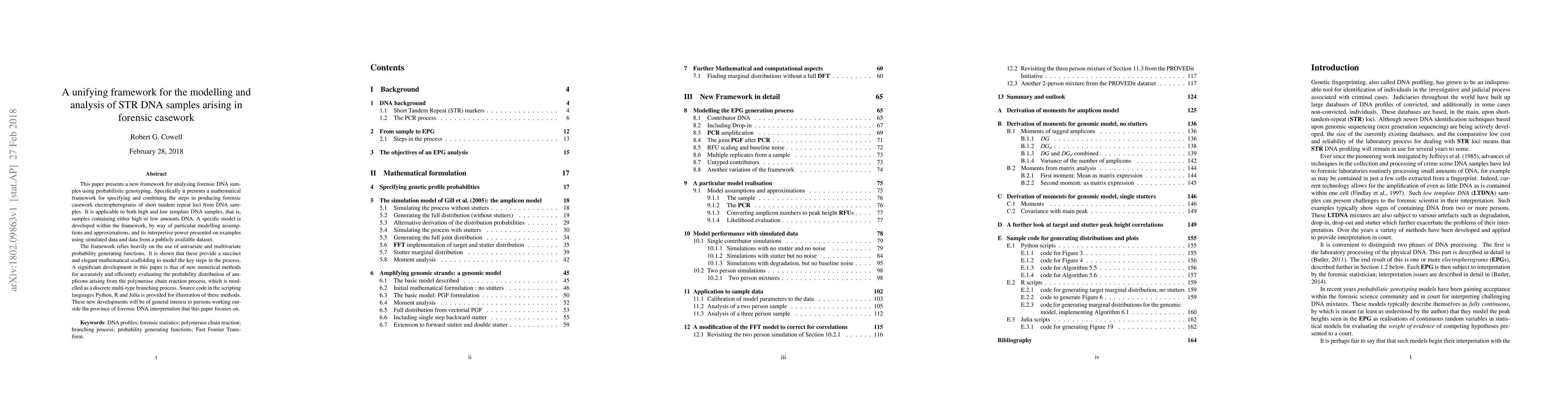 This paper presents a new framework for analysing forensic DNA samples using probabilistic genotyping. Specifically it presents a mathematical framework for specifying and combining the steps in producing forensic casework electropherograms of short tandem repeat loci from DNA samples. It is applicable to both high and low template DNA samples, that is, samples containing either high or low amounts DNA. A specific model is developed within the framework, by way of particular modelling assumptions and approximations, and its interpretive power presented on examples using simulated data and data from a publicly available dataset. The framework relies heavily on the use of univariate and multivariate probability generating functions. It is shown that these provide a succinct and elegant mathematical scaffolding to model the key steps in the process. A significant development in this paper is that of new numerical methods for accurately and efficiently evaluating the probability distribution of amplicons arising from the polymerase chain reaction process, which is modelled as a discrete multi-type branching process. Source code in the scripting languages Python, R and Julia is provided for illustration of these methods. These new developments will be of general interest to persons working outside the province of forensic DNA interpretation that this paper focuses on.
