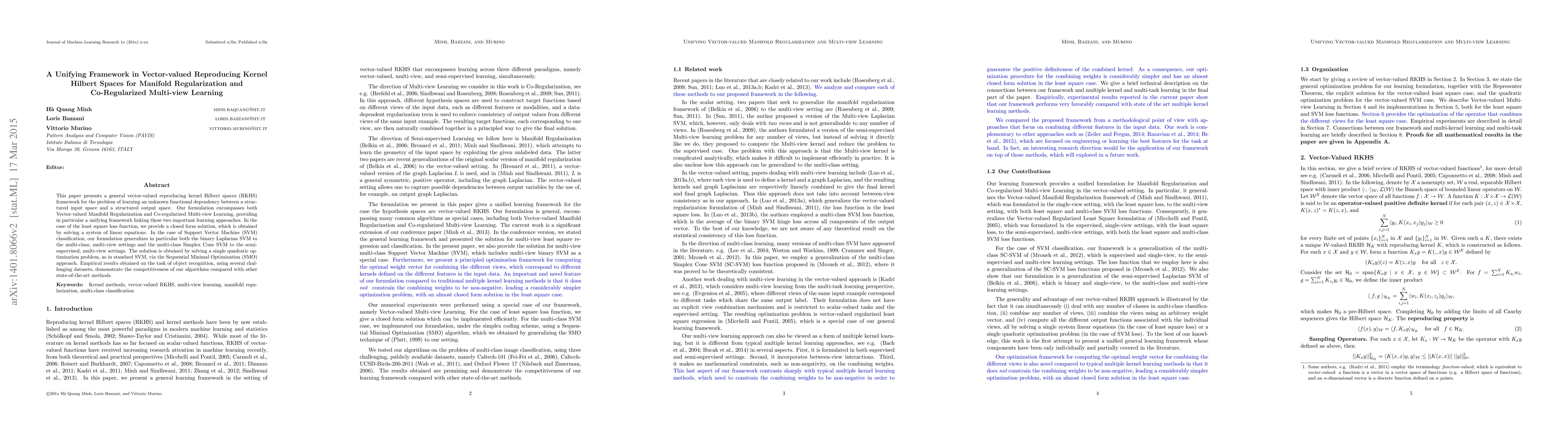 This paper introduces a unifying framework in vector-valued reproducing kernel Hilbert spaces for manifold regularization and co-regularized multi-view learning, providing closed-form solutions for least squares and quadratic optimization for SVM classification. Empirical results show competitive performance in object recognition tasks.