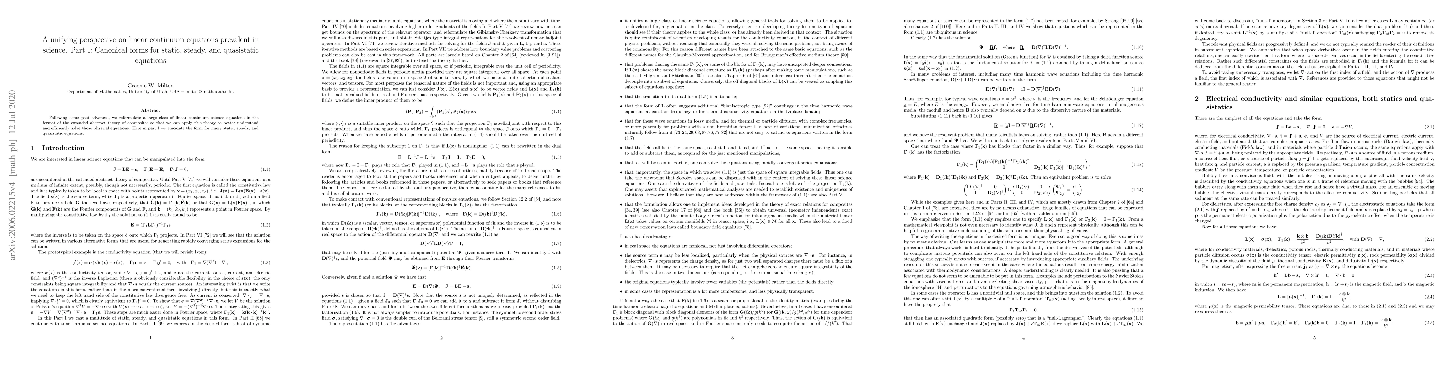 Following some past advances, we reformulate a large class of linear continuum science equations in the format of the extended abstract theory of composites so that we can apply this theory to better understand and efficiently solve those equations. Here in part I we elucidate the form for many static, steady, and quasistatic equations.