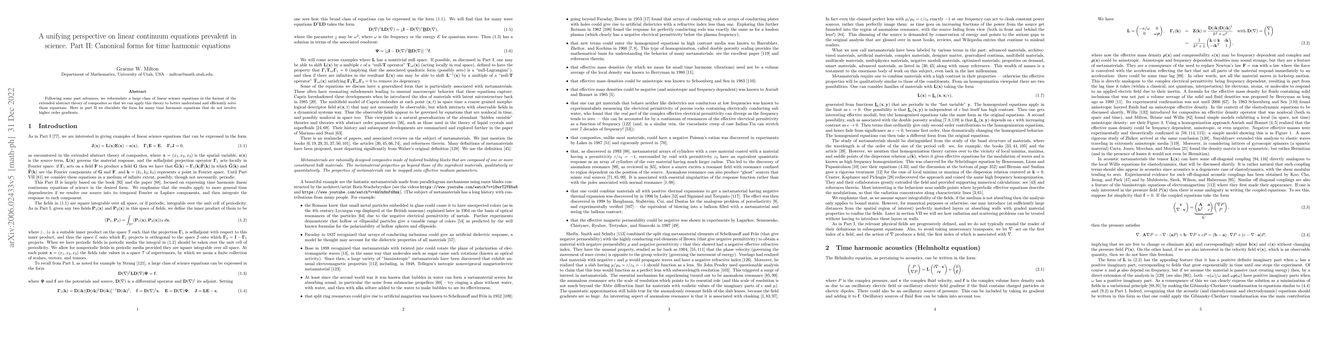 This paper reformulates a broad range of linear continuum science equations using the extended abstract theory of composites, focusing in part II on canonical forms for time-harmonic equations that exclude higher-order gradients, facilitating better understanding and efficient solutions.