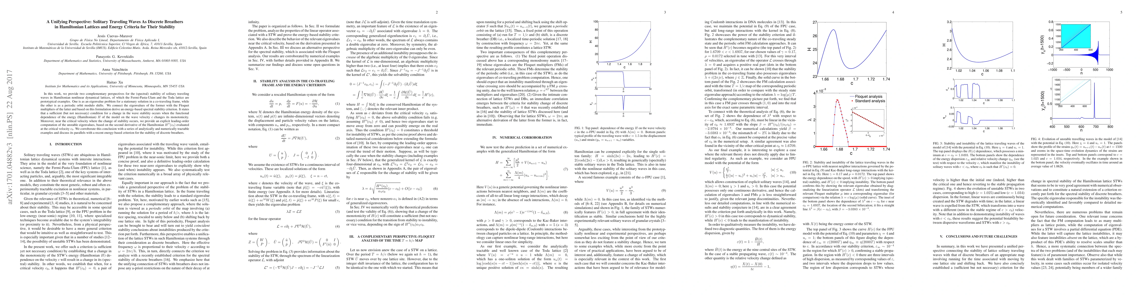 This paper presents two perspectives on the stability of solitary traveling waves in Hamiltonian nonlinear dynamical lattices, connecting eigenvalues and Floquet multipliers to derive an energy-based stability criterion. It concludes that a change in wave stability occurs when the energy's functional dependence on wave velocity loses monotonicity, with explicit computations near critical velocities.