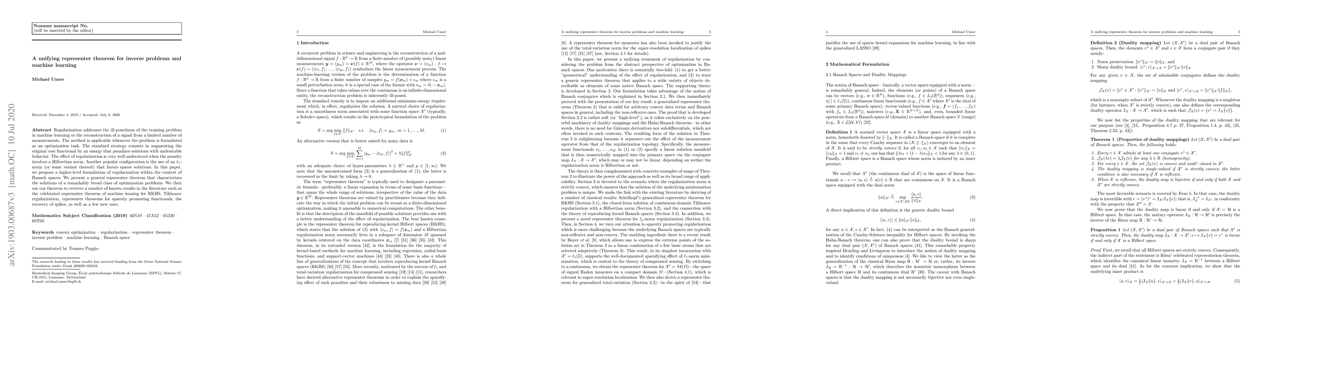 This paper proposes a unifying representer theorem for regularization in inverse problems and machine learning, presenting a general formulation within Banach spaces that encompasses various known results and introduces new insights. The theorem characterizes solutions to a wide range of optimization problems, including those involving Hilbertian norms and $\ell_1$-norms for sparsity.