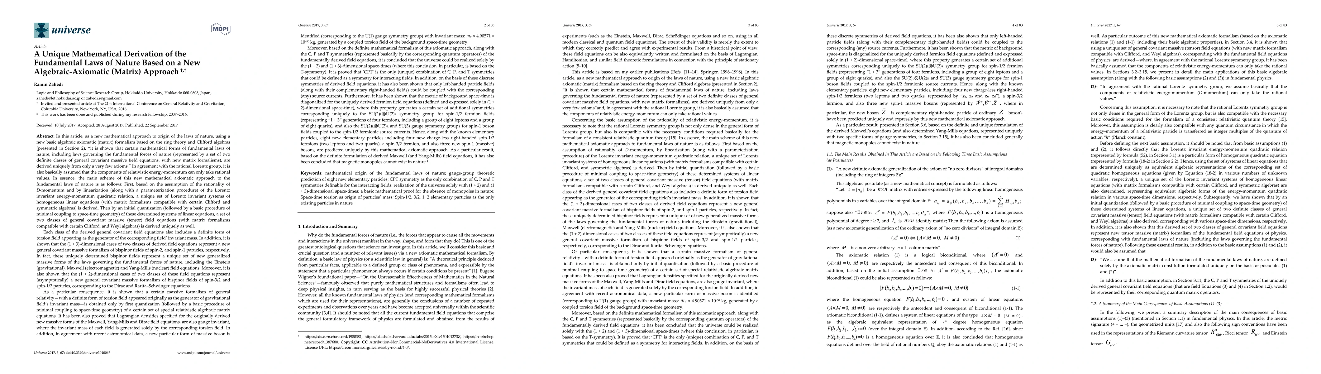 In this article, as a new mathematical approach to origin of the basic laws of nature, using a new algebra-axiomatic matrix formalism based on the ring theory and Clifford algebras , "it is shown that certain mathematical forms of fundamental laws of nature, including laws governing the fundamental forces of nature (represented by a set of two definite classes of general covariant massive field equations, with new matrix formalisms), are derived uniquely (& completely) from only a very few axioms"; where in agreement with the rational Lorentz group, it is also basically assumed that the components of relativistic energy-momentum can only take rational values. Based on the definite mathematical formalism of this axiomatic approach, along with the C, P and T symmetries (represented by the corresponding quantum matrix operators) of the fundamentally derived field equations, it is concluded that the universe could be realized solely with the (1+2) and (1+3)-dimensional space-times. Moreover, it is shown that the (1+3)-dimensional cases of derived two classes of field equations, represent respectively new massive forms of bispinor fields of spin-2, and spin-1 particles; and (1+2)-dimensional cases of these equations represent (asymptotically) new massive forms of bispinor fields of spin-3/2 and spin-1/2 particles, respectively. On this basis, following certain forms of the gauge symmetries of these derived fields, along with the known elementary particles, eight new elementary particles including a spin-3/2 fermion, two chargeless leptons, two chargeless quarks, and three spin-1 (massive) bosons are predicted uniquely by this axiomatic matrix approach. As a particular result, based on the definite formulation of derived field equations, it has also been concluded that magnetic monopoles cannot exist in nature.