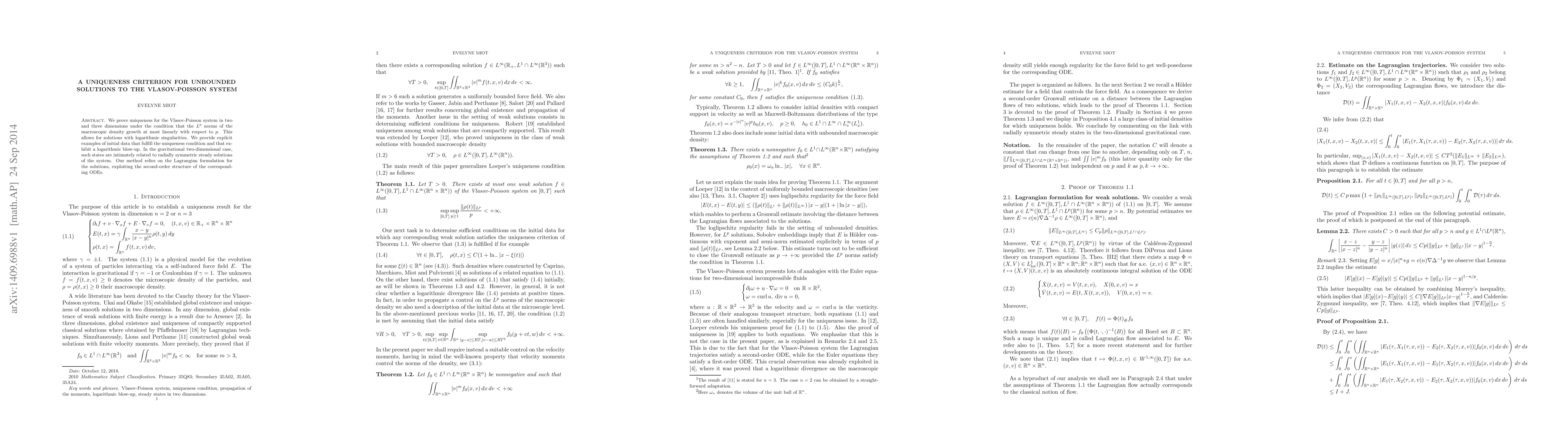 This paper proves uniqueness for the Vlasov-Poisson system in two and three dimensions when the macroscopic density grows at most linearly with respect to $L^p$ norms, allowing for logarithmic singularities. The authors provide examples of initial data that meet this condition and exhibit logarithmic blow-up, particularly in the gravitational two-dimensional case.