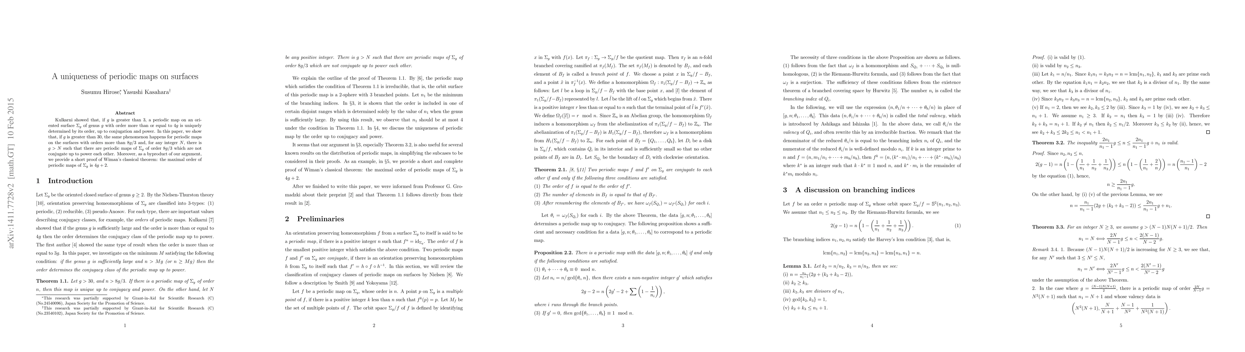 This paper extends Kulkarni's result on the uniqueness of periodic maps on surfaces, showing that for genus g greater than 30, periodic maps with orders more than 8g/3 are uniquely determined by their order. It also proves that there exist genus g values greater than any integer N where periodic maps of order 8g/3 are not conjugate to each other, and provides a concise proof of Wiman's theorem on the maximal order of periodic maps.