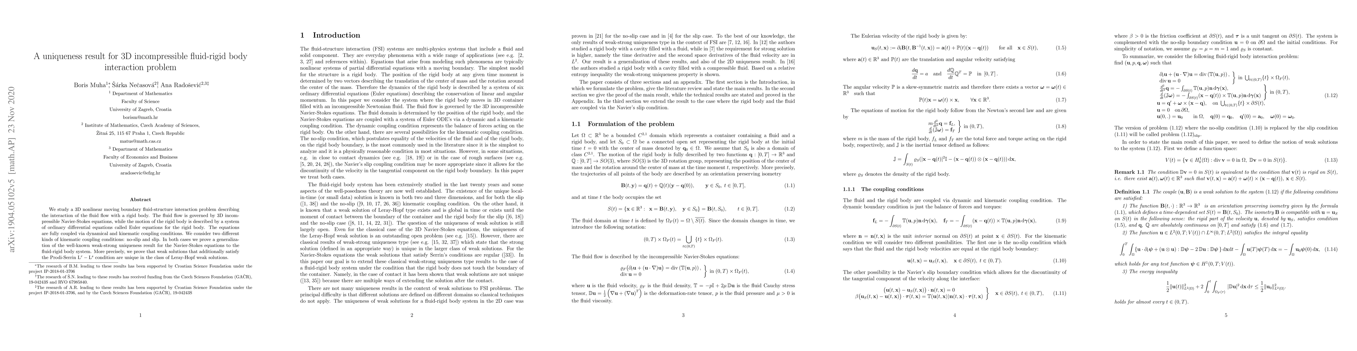This paper investigates the 3D incompressible fluid-rigid body interaction problem, governed by coupled Navier-Stokes and Euler equations. The authors prove a uniqueness result for weak solutions satisfying specific conditions, extending the classical weak-strong uniqueness result for the Navier-Stokes equations to this fluid-rigid body system.