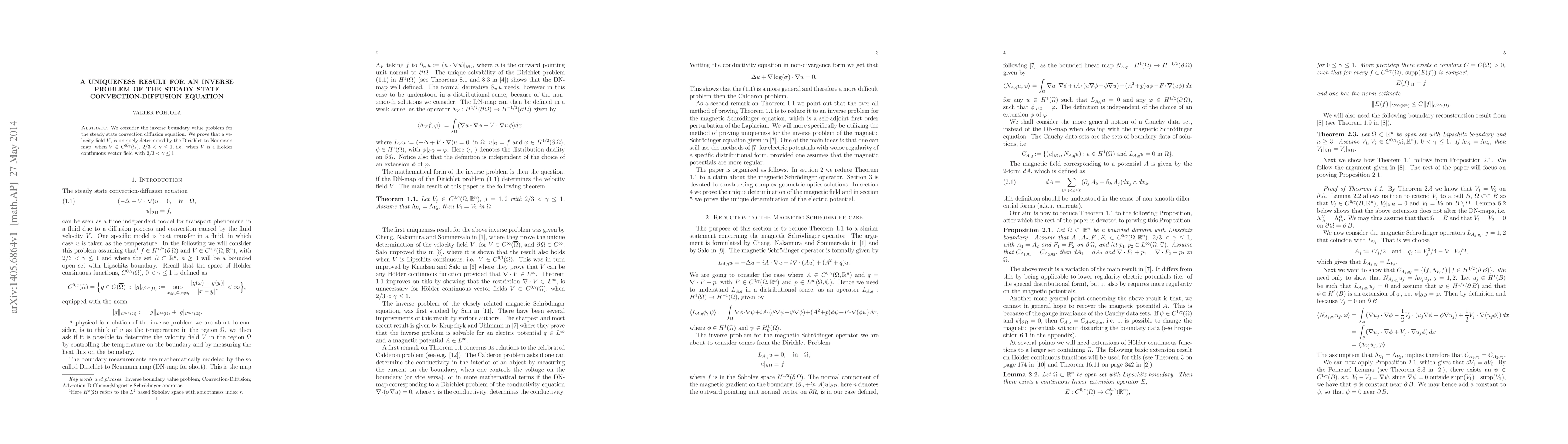 We consider the inverse boundary value problem for the steady state convection diffusion equation. We prove that a velocity field $V$, is uniquely determined by the Dirichlet-to-Neumann map, when $V \in C^{0,\gamma} (\Omega)$, $2/3< \gamma \leq 1$, i.e. when $V$ is a H\"older continuous vector field with $2/3< \gamma \leq 1$.