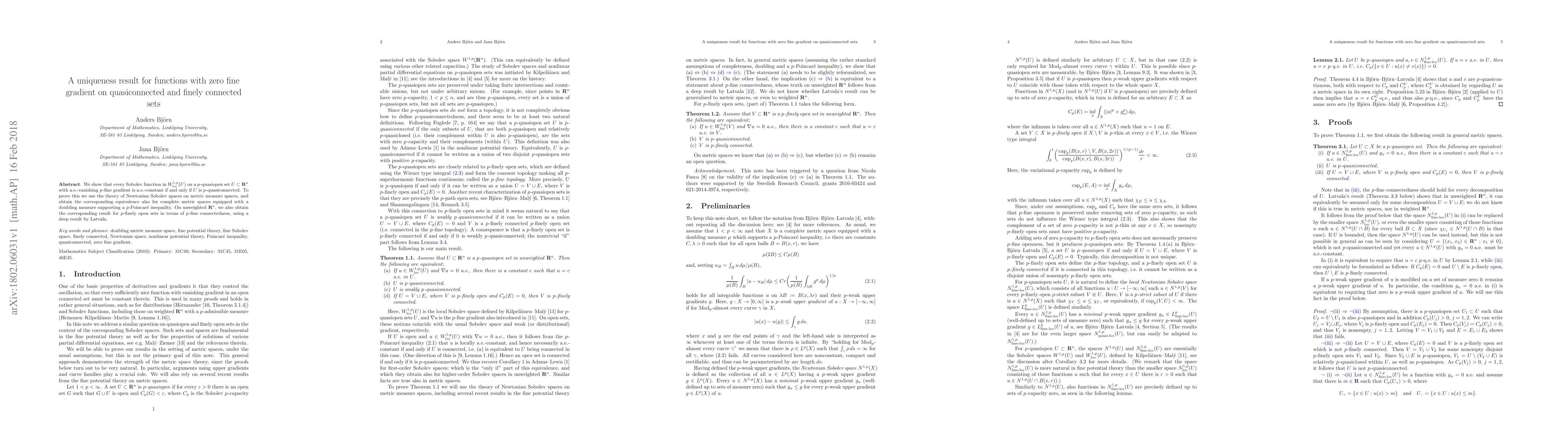 We show that every Sobolev function in $W^{1,p}_{\textrm{loc}}(U)$ on a $p$-quasiopen set $U \subset {\bf R}^n$ with a.e.-vanishing $p$-fine gradient is a.e.-constant if and only if $U$ is $p$-quasiconnected. To prove this we use the theory of Newtonian Sobolev spaces on metric measure spaces, and obtain the corresponding equivalence also for complete metric spaces equipped with a doubling measure supporting a $p$-Poincar\'e inequality. On unweighted ${\bf R}^n$, we also obtain the corresponding result for $p$-finely open sets in terms of $p$-fine connectedness, using a deep result by Latvala.
