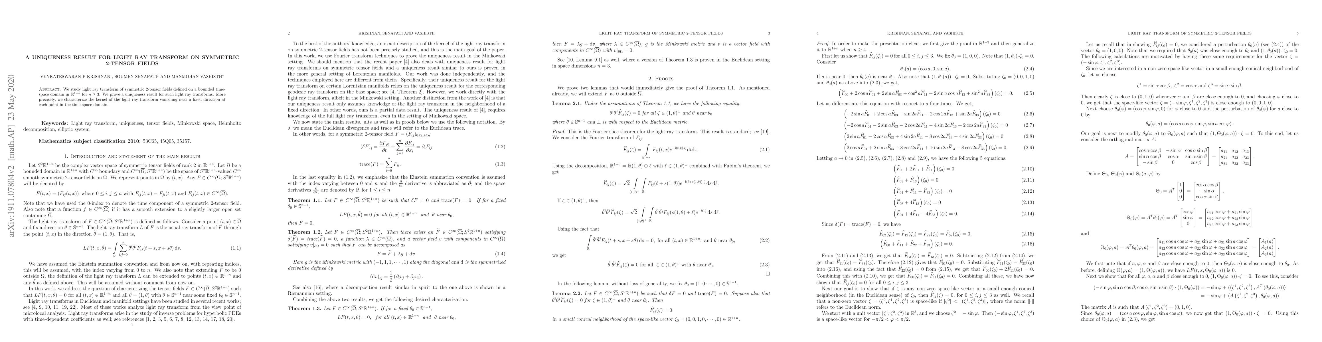 Researchers prove a uniqueness result for light ray transforms of symmetric 2-tensor fields, showing that any two transforms vanishing near a fixed direction at each point in the time-space domain must be identical.