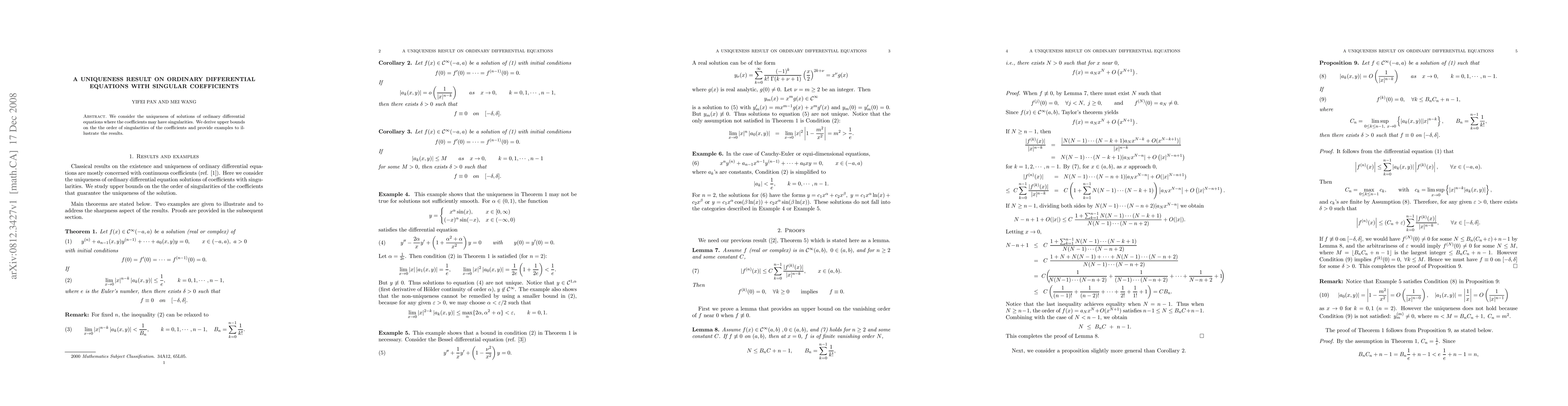 This paper investigates the uniqueness of solutions for ordinary differential equations with singular coefficients, establishing upper bounds on the order of these singularities and providing illustrative examples to demonstrate the findings.