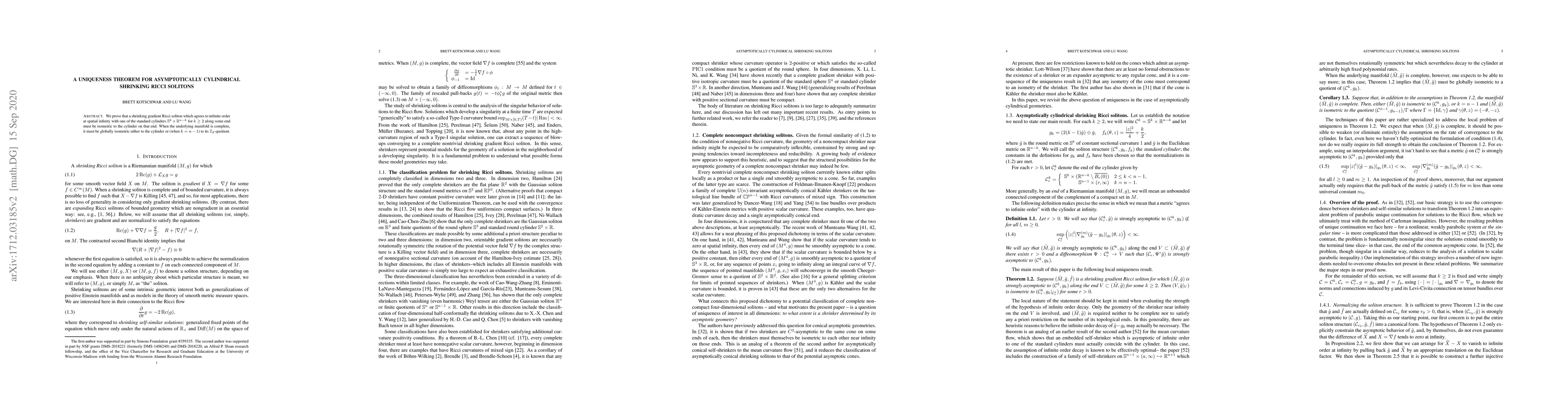 We prove that a shrinking gradient Ricci soliton which agrees to infinite order at spatial infinity with one of the standard cylindrical metrics on $S^k\times \RR^{n-k}$ for $k\geq 2$ along some end must be isometric to the cylinder on that end. When the underlying manifold is complete, it must be globally isometric either to the cylinder or (when $k=n-1$) to its $\ZZ_2$-quotient.