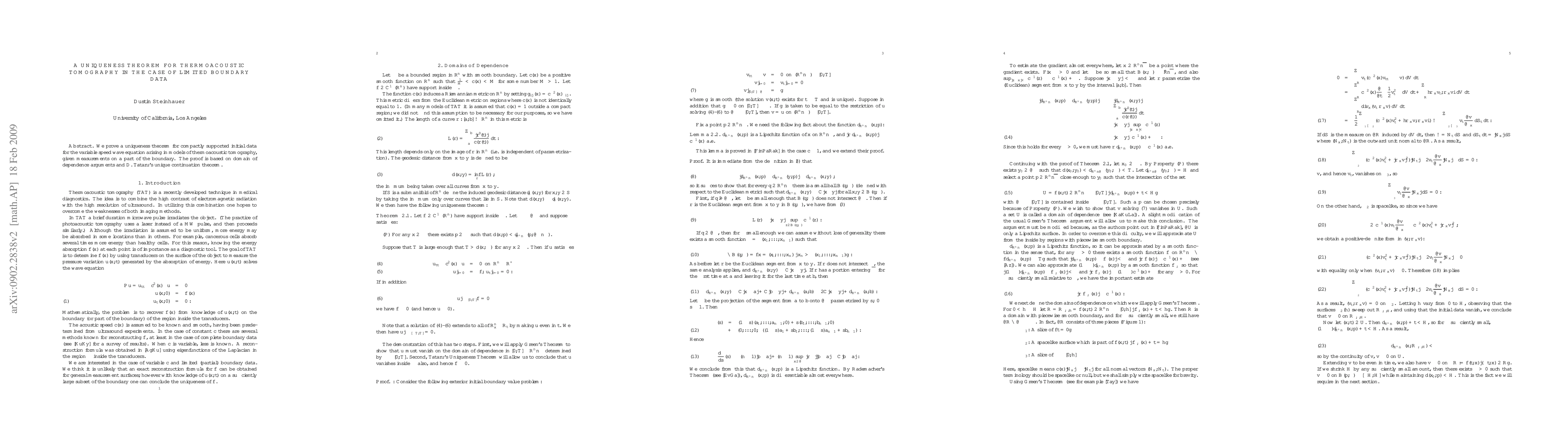 This paper proves a uniqueness theorem for thermoacoustic tomography with limited boundary data, showing that compactly supported initial data can be uniquely determined using measurements on a part of the boundary. The proof leverages domain of dependence arguments and D. Tataru's unique continuation theorem.