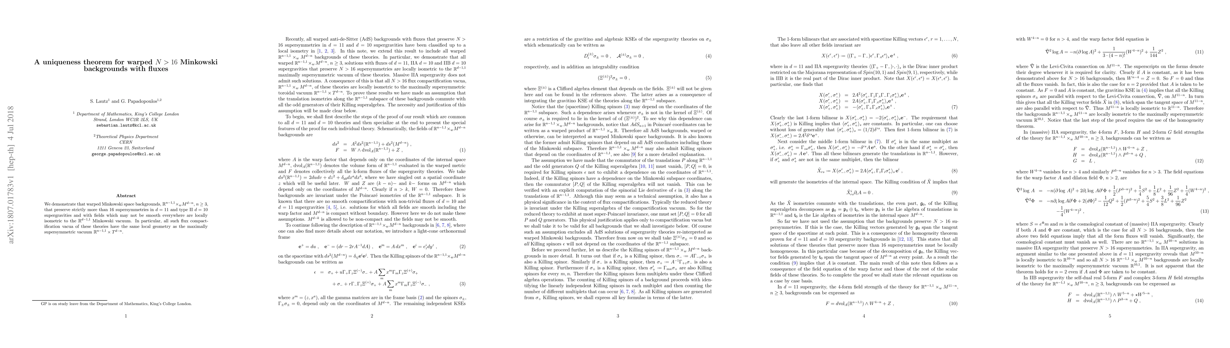 This paper proves a uniqueness theorem for warped Minkowski backgrounds preserving more than 16 supersymmetries in 11D and 10D supergravities, showing they are locally isometric to the maximally supersymmetric Minkowski vacuum $\mathbb{R}^{d-1,1}$. Such flux compactifications share the same local geometry.