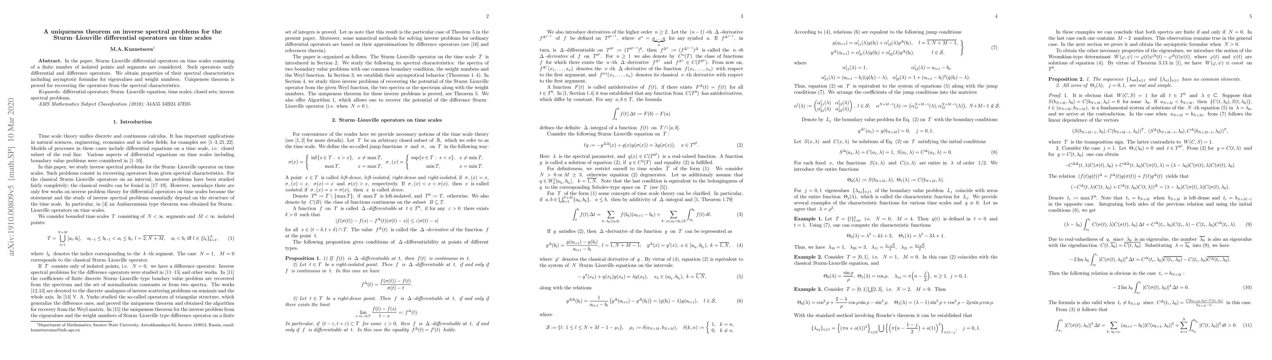 This paper establishes a uniqueness theorem for recovering Sturm-Liouville differential operators on time scales from their spectral characteristics, including asymptotic formulae for eigenvalues and weight numbers. The study unifies differential and difference operators through these operators on isolated points and segments.