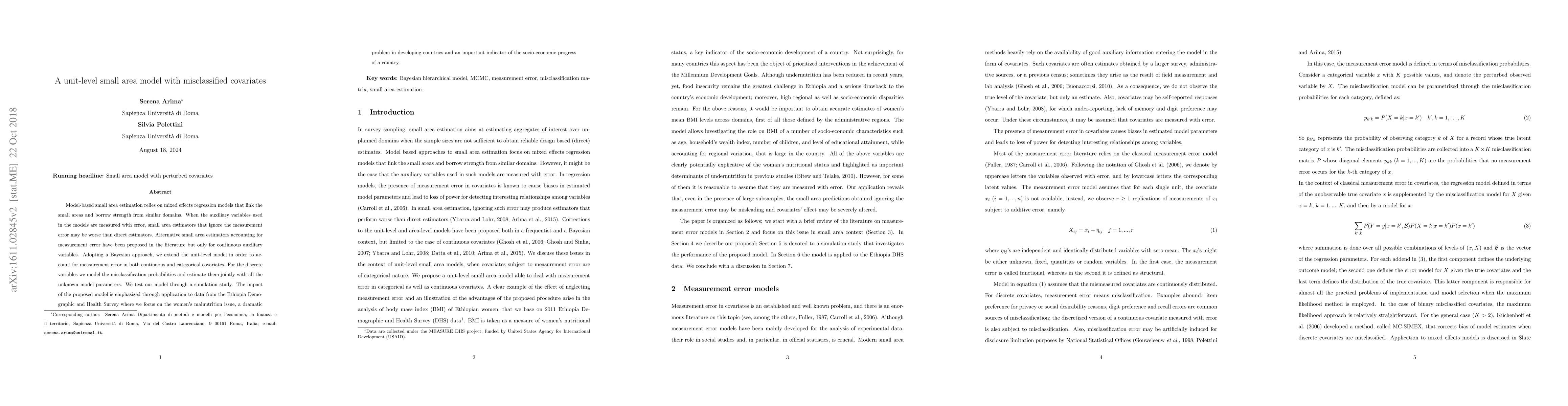 This paper proposes a Bayesian small area model that accounts for measurement error in both continuous and categorical covariates, modeling misclassification probabilities for discrete variables. The effectiveness of the model is demonstrated through simulations and an application to Ethiopian Demographic and Health Survey data focusing on women's malnutrition.