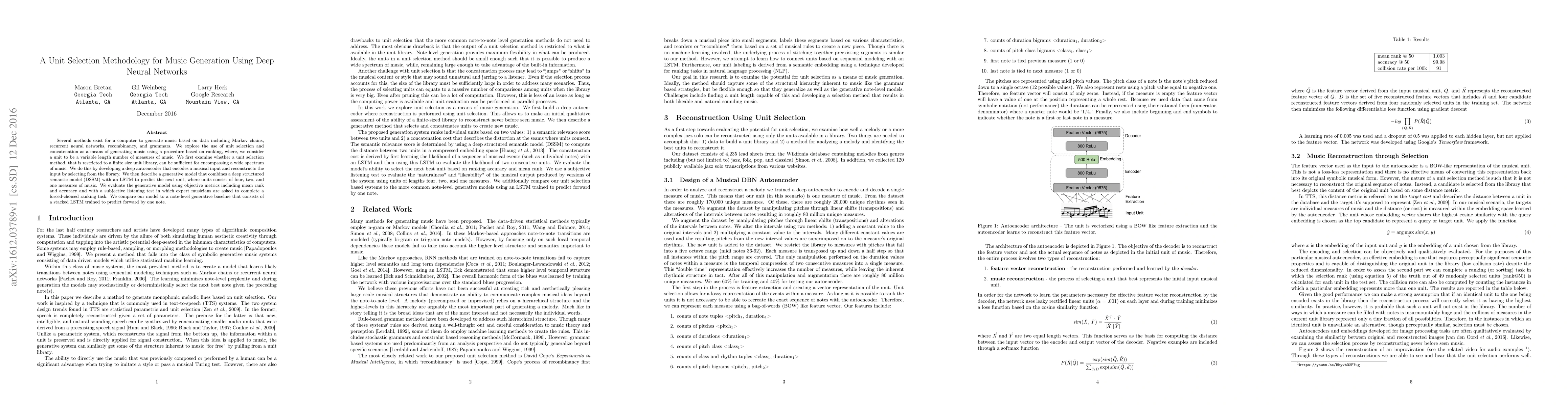 Researchers developed a method for generating music using deep neural networks that combines unit selection with ranking to create a wide spectrum of music styles. Their model outperformed a baseline note-level generative model in both objective metrics and subjective listening tests.