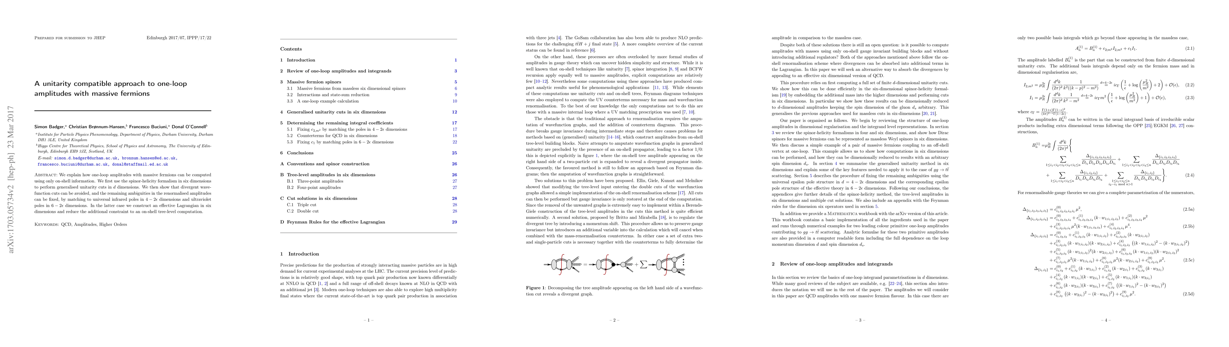 We explain how one-loop amplitudes with massive fermions can be computed using only on-shell information. We first use the spinor-helicity formalism in six dimensions to perform generalised unitarity cuts in $d$ dimensions. We then show that divergent wavefunction cuts can be avoided, and the remaining ambiguities in the renormalised amplitudes can be fixed, by matching to universal infrared poles in $4-2\epsilon$ dimensions and ultraviolet poles in $6-2\epsilon$ dimensions. In the latter case we construct an effective Lagrangian in six dimensions and reduce the additional constraint to an on-shell tree-level computation.