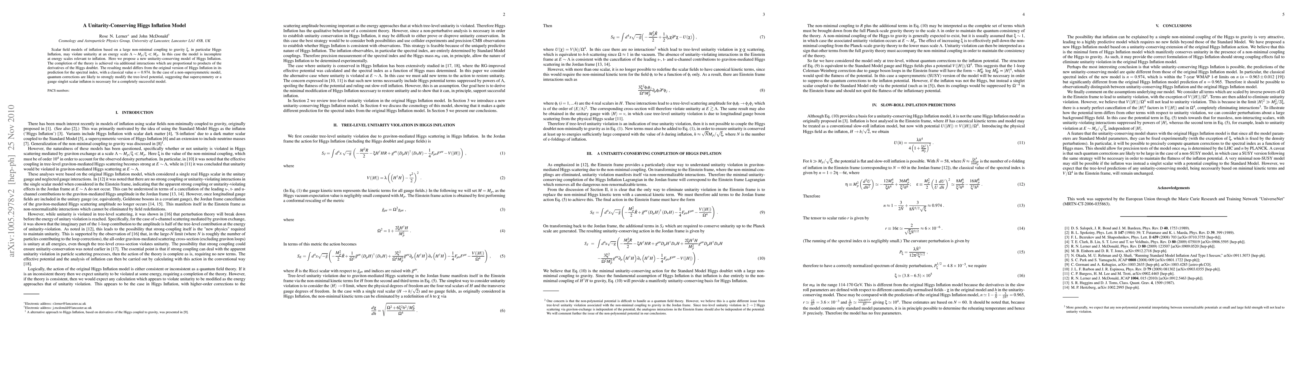 This paper proposes a unitarity-conserving version of Higgs inflation by introducing additional derivative interactions to avoid high-energy violations. The new model predicts a spectral index of n = 0.974, differing from the original version, and suggests that supersymmetry or a gauge singlet scalar may be necessary for a fully successful model.