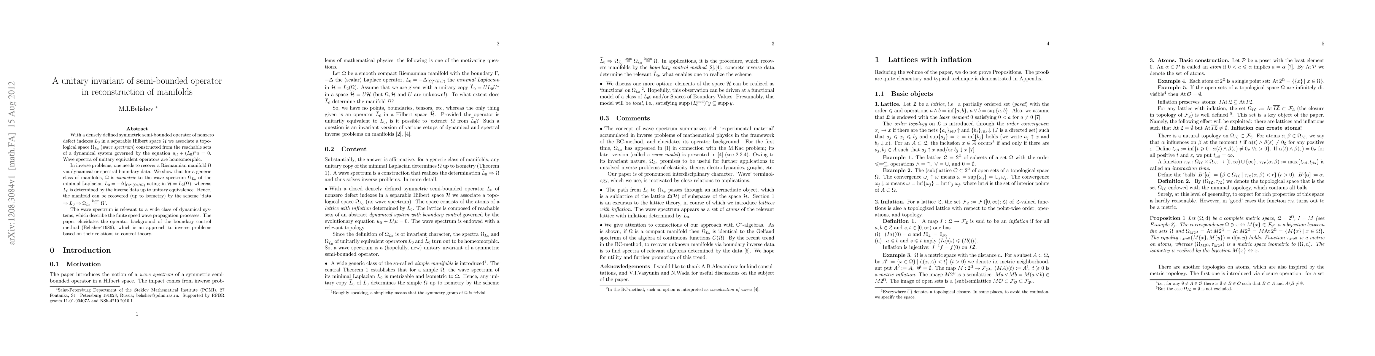 With a densely defined symmetric semi-bounded operator of nonzero defect indexes $L_0$ in a separable Hilbert space ${\cal H}$ we associate a topological space $\Omega_{L_0}$ ({\it wave spectrum}) constructed from the reachable sets of a dynamical system governed by the equation $u_{tt}+(L_0)^*u=0$. Wave spectra of unitary equivalent operators are homeomorphic. In inverse problems, one needs to recover a Riemannian manifold $\Omega$ via dynamical or spectral boundary data. We show that for a generic class of manifolds, $\Omega$ is isometric to the wave spectrum $\Omega_{L_0}$ of the minimal Laplacian $L_0=-\Delta|_{C^\infty_0(\Omega\backslash \partial \Omega)}$ acting in ${\cal H}=L_2(\Omega)$, whereas $L_0$ is determined by the inverse data up to unitary equivalence. Hence, the manifold can be recovered (up to isometry) by the scheme `data $\Rightarrow L_0 \Rightarrow \Omega_{L_0} \overset{\rm isom}= \Omega$'. The wave spectrum is relevant to a wide class of dynamical systems, which describe the finite speed wave propagation processes. The paper elucidates the operator background of the boundary control method (Belishev`1986), which is an approach to inverse problems based on their relations to control theory.