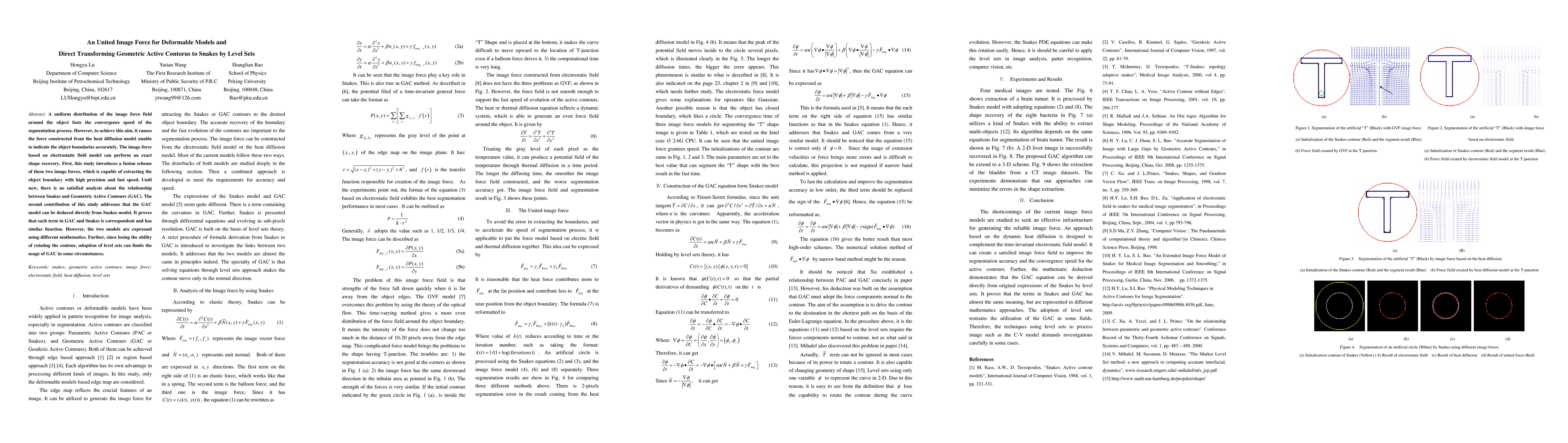 A uniform distribution of the image force field around the object fasts the convergence speed of the segmentation process. However, to achieve this aim, it causes the force constructed from the heat diffusion model unable to indicate the object boundaries accurately. The image force based on electrostatic field model can perform an exact shape recovery. First, this study introduces a fusion scheme of these two image forces, which is capable of extracting the object boundary with high precision and fast speed. Until now, there is no satisfied analysis about the relationship between Snakes and Geometric Active Contours (GAC). The second contribution of this study addresses that the GAC model can be deduced directly from Snakes model. It proves that each term in GAC and Snakes is correspondent and has similar function. However, the two models are expressed using different mathematics. Further, since losing the ability of rotating the contour, adoption of level sets can limits the usage of GAC in some circumstances.