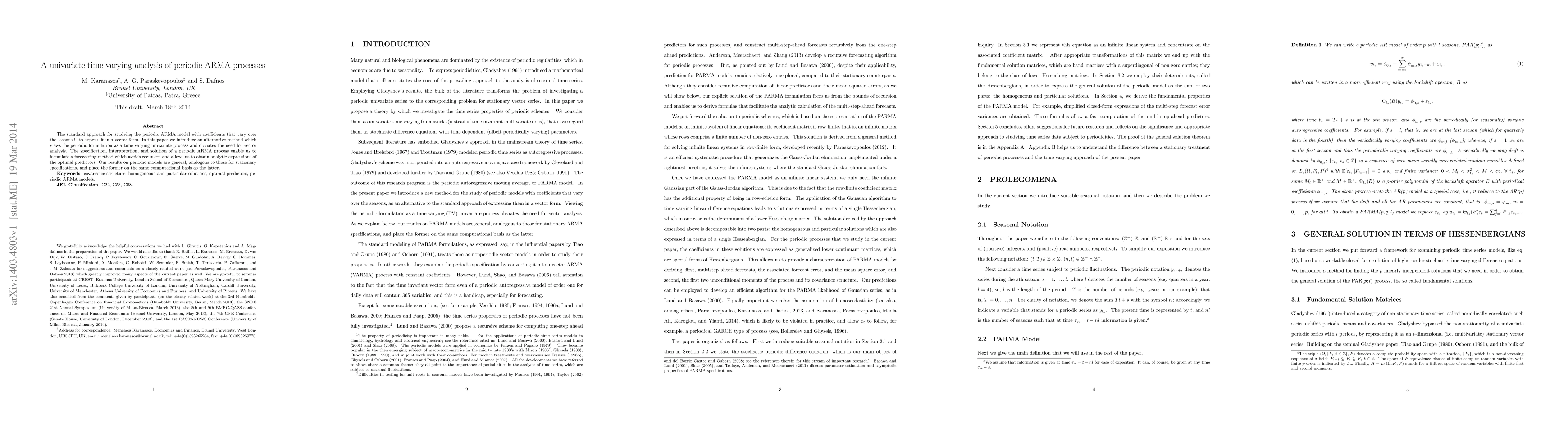The standard approach for studying the periodic ARMA model with coefficients that vary over the seasons is to express it in a vector form. In this paper we introduce an alternative method which views the periodic formulation as a time varying univariate process and obviates the need for vector analysis. The specification, interpretation, and solution of a periodic ARMA process enable us to formulate a forecasting method which avoids recursion and allows us to obtain analytic expressions of the optimal predictors. Our results on periodic models are general, analogous to those for stationary specifications, and place the former on the same computational basis as the latter.