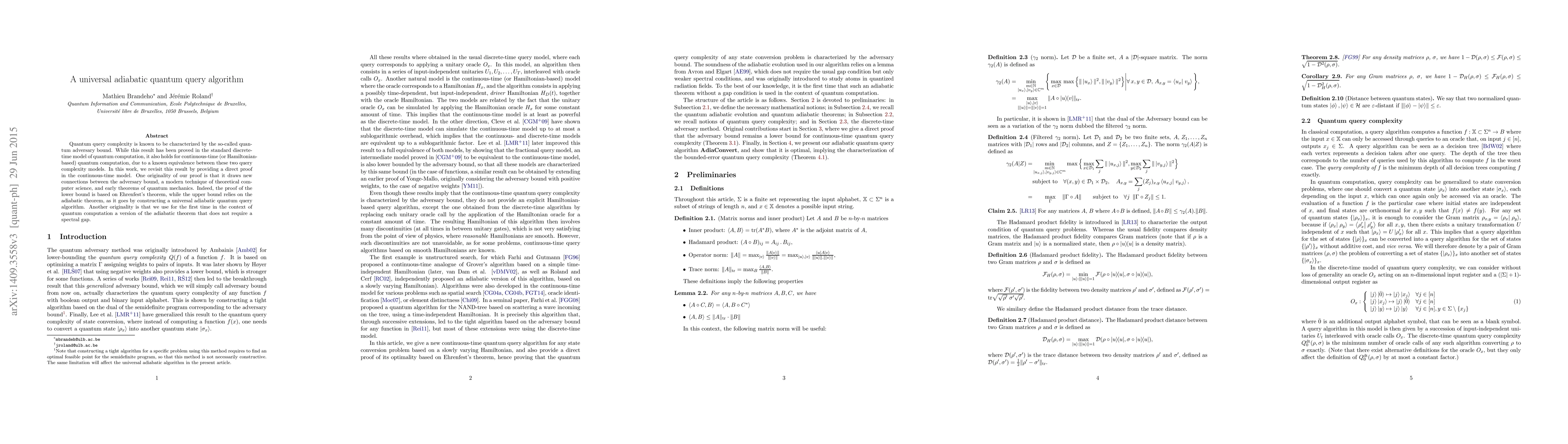 Quantum query complexity is known to be characterized by the so-called quantum adversary bound. While this result has been proved in the standard discrete-time model of quantum computation, it also holds for continuous-time (or Hamiltonian-based) quantum computation, due to a known equivalence between these two query complexity models. In this work, we revisit this result by providing a direct proof in the continuous-time model. One originality of our proof is that it draws new connections between the adversary bound, a modern technique of theoretical computer science, and early theorems of quantum mechanics. Indeed, the proof of the lower bound is based on Ehrenfest's theorem, while the upper bound relies on the adiabatic theorem, as it goes by constructing a universal adiabatic quantum query algorithm. Another originality is that we use for the first time in the context of quantum computation a version of the adiabatic theorem that does not require a spectral gap.