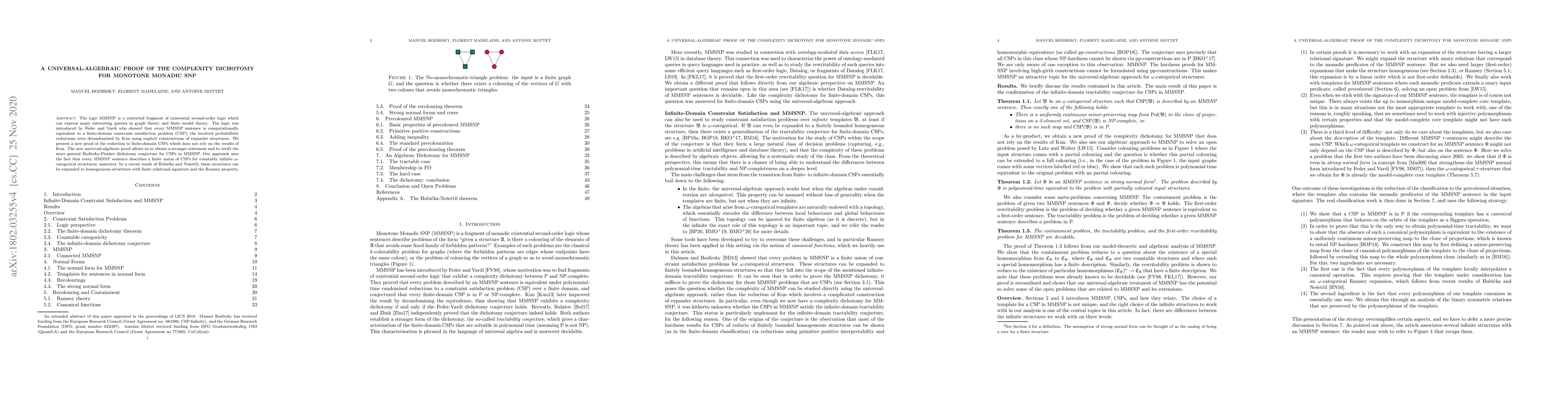 The logic MMSNP is a restricted fragment of existential second-order logic which allows to express many interesting queries in graph theory and finite model theory. The logic was introduced by Feder and Vardi who showed that every MMSNP sentence is computationally equivalent to a finite-domain constraint satisfaction problem (CSP); the involved probabilistic reductions were derandomized by Kun using explicit constructions of expander structures. We present a new proof of the reduction to finite-domain CSPs which does not rely on the results of Kun. This new proof allows us to obtain a stronger statement and to verify the more general Bodirsky-Pinsker dichotomy conjecture for CSPs in MMSNP. Our approach uses the fact that every MMSNP sentence describes a finite union of CSPs for countably infinite $\omega$-categorical structures; moreover, by a recent result of Hubi\v{c}ka and Ne\v{s}et\v{r}il, these structures can be expanded to homogeneous structures with finite relational signature and the Ramsey property. This allows us to use the universal-algebraic approach to study the computational complexity of MMSNP.