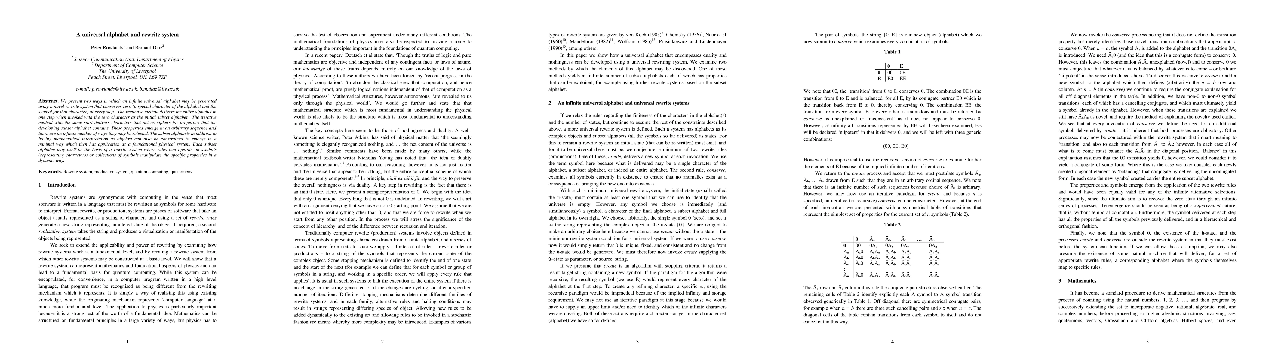 We present two ways in which an infinite universal alphabet may be generated using a novel rewrite system that conserves zero (a special character of the alphabet and the symbol for that character) at every step. The recursive method delivers the entire alphabet in one step when invoked with the zero character as the initial subset alphabet. The iterative method with the same start delivers characters that act as ciphers for properties that the developing subset alphabet contains. These properties emerge in an arbitrary sequence and there are an infinite number of ways they may be selected. The subset alphabets in addition to having mathematical interpretation as algebra can also be constrained to emerge in a minimal way which then has application as a foundational physical system. Each subset alphabet may itself be the basis of a rewrite system where rules that operate on symbols (representing characters) or collections of symbols manipulate the specific properties in a dynamic way.
