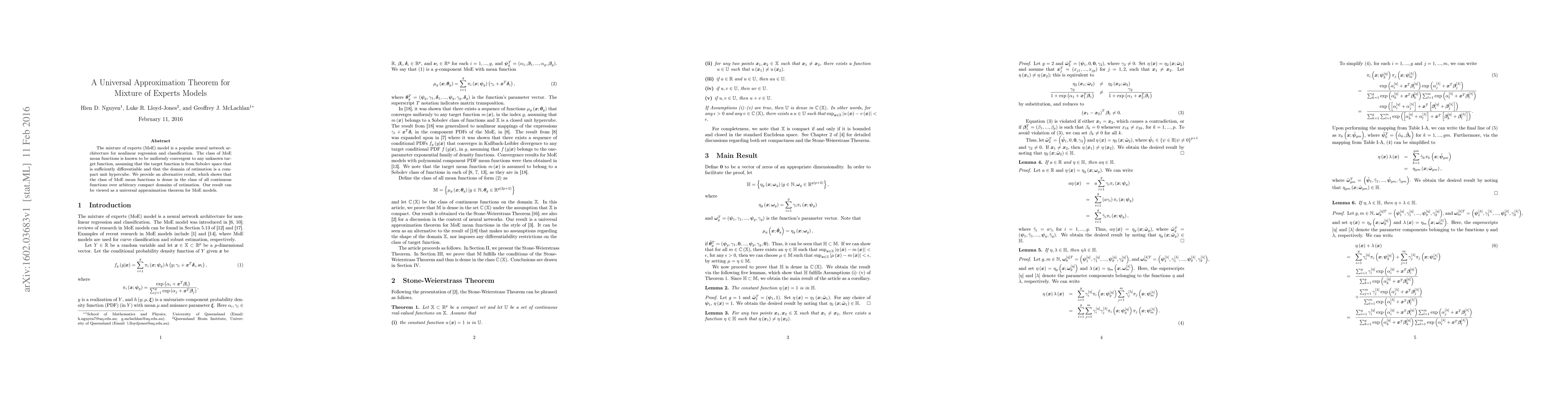 The mixture of experts (MoE) model is a popular neural network architecture for nonlinear regression and classification. The class of MoE mean functions is known to be uniformly convergent to any unknown target function, assuming that the target function is from Sobolev space that is sufficiently differentiable and that the domain of estimation is a compact unit hypercube. We provide an alternative result, which shows that the class of MoE mean functions is dense in the class of all continuous functions over arbitrary compact domains of estimation. Our result can be viewed as a universal approximation theorem for MoE models.