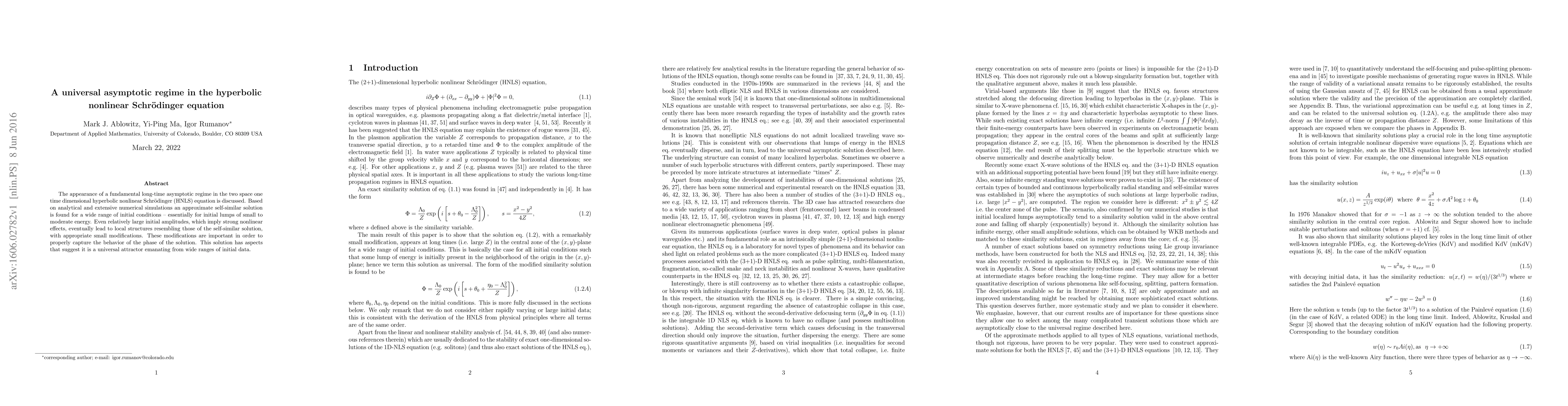 The appearance of a fundamental long-time asymptotic regime in the two space one time dimensional hyperbolic nonlinear Schr\"odinger (HNLS) equation is discussed. Based on analytical and extensive numerical simulations an approximate self-similar solution is found for a wide range of initial conditions -- essentially for initial lumps of small to moderate energy. Even relatively large initial amplitudes, which imply strong nonlinear effects, eventually lead to local structures resembling those of the self-similar solution, with appropriate small modifications. These modifications are important in order to properly capture the behavior of the phase of the solution. This solution has aspects that suggest it is a universal attractor emanating from wide ranges of initial data.