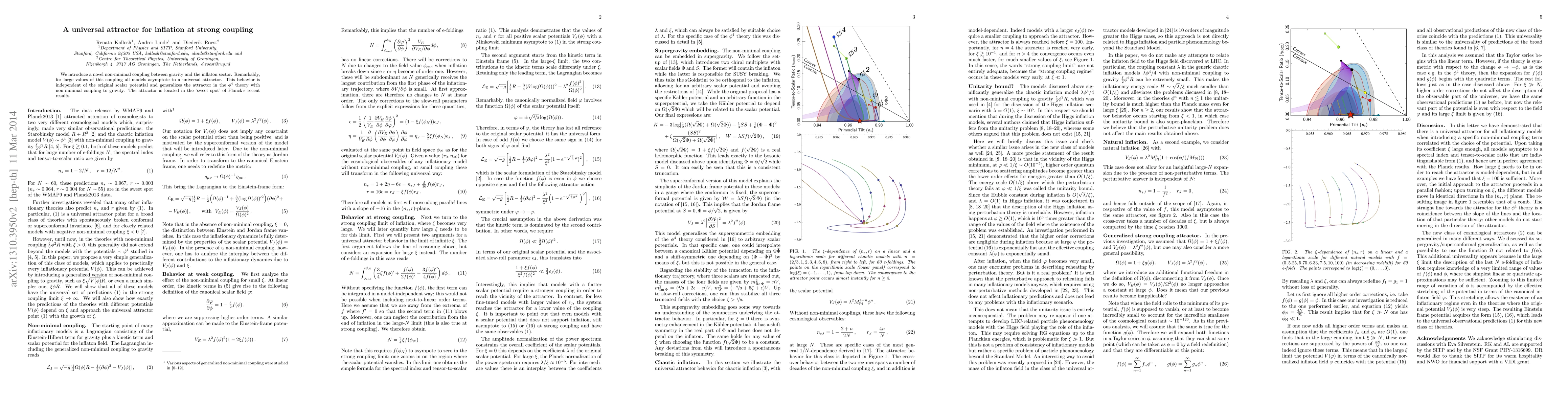 This research presents a new non-minimal coupling between gravity and inflaton, revealing a universal attractor for inflation at strong coupling. This attractor is independent of the original scalar potential and aligns with Planck's findings, generalizing the phi^4 theory attractor.