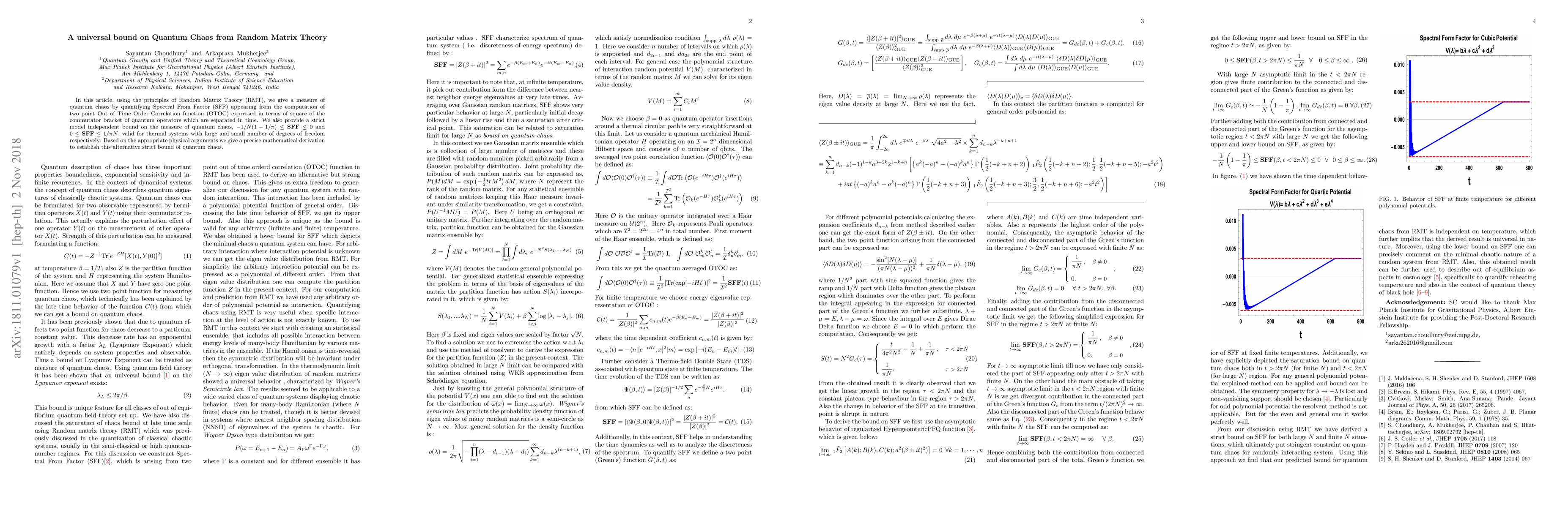 Researchers used Random Matrix Theory to establish a universal bound on quantum chaos, revealing that the measure of chaos is bounded between -1/N(1-1/pi) and 1/pi N for thermal systems with large and small number of degrees of freedom.
