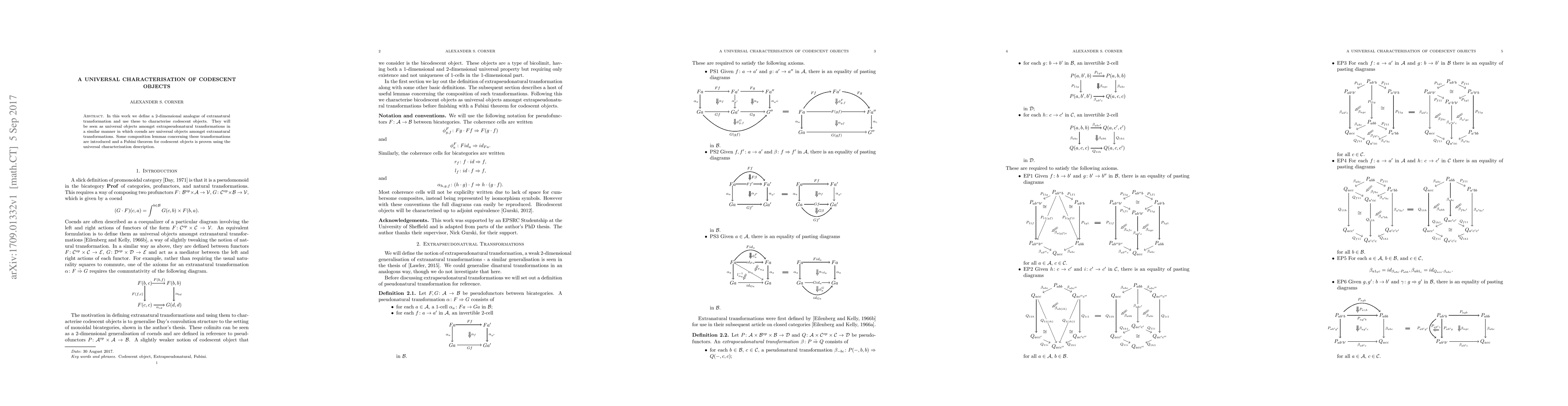 This paper defines a 2-dimensional analogue of extranatural transformations to characterise codescent objects, establishing them as universal objects among extrapseudonatural transformations akin to coends in the context of extranatural transformations. The paper also presents composition lemmas and proves a Fubini theorem for codescent objects.