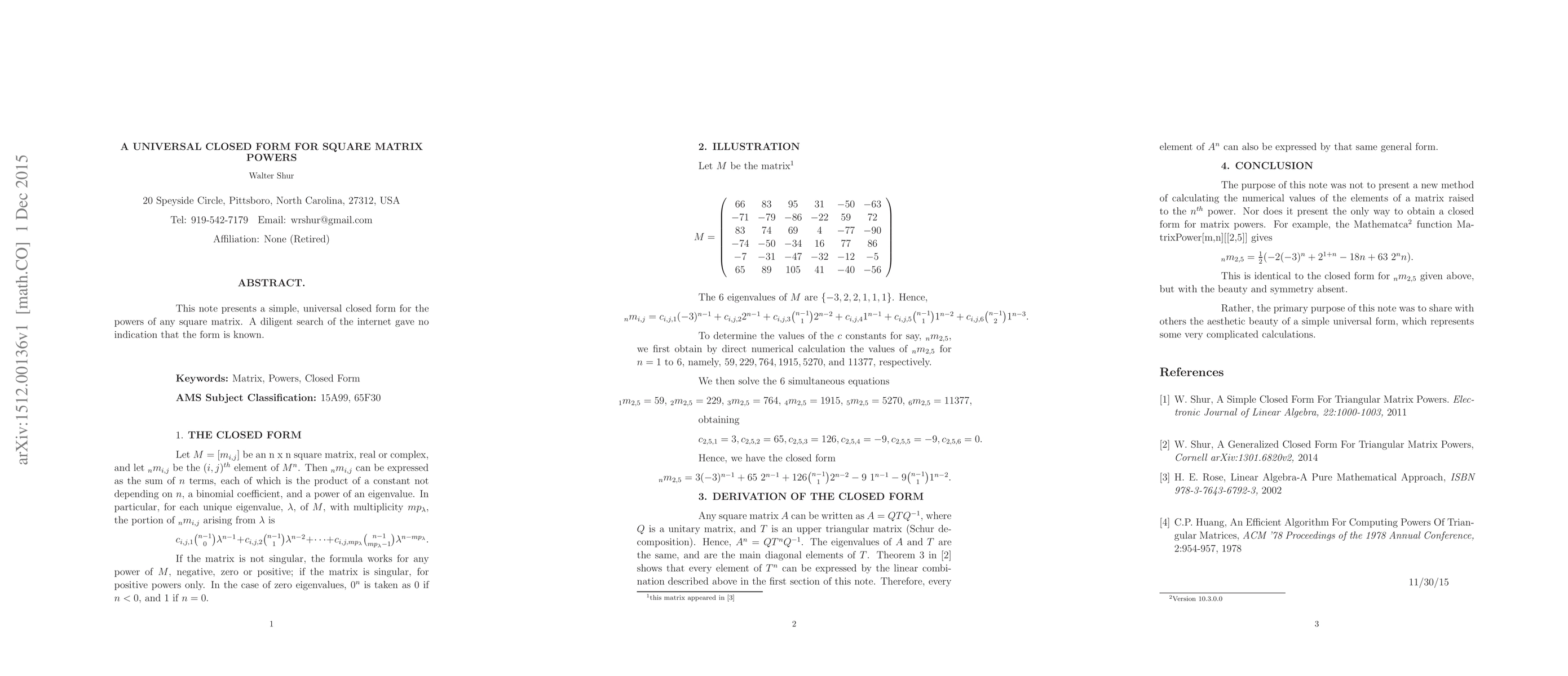 Summary: This paper introduces a novel, universal closed form expression for computing the powers of any square matrix, asserting its novelty through an extensive online search. The simplicity and generality of this formula could significantly streamline matrix power calculations.