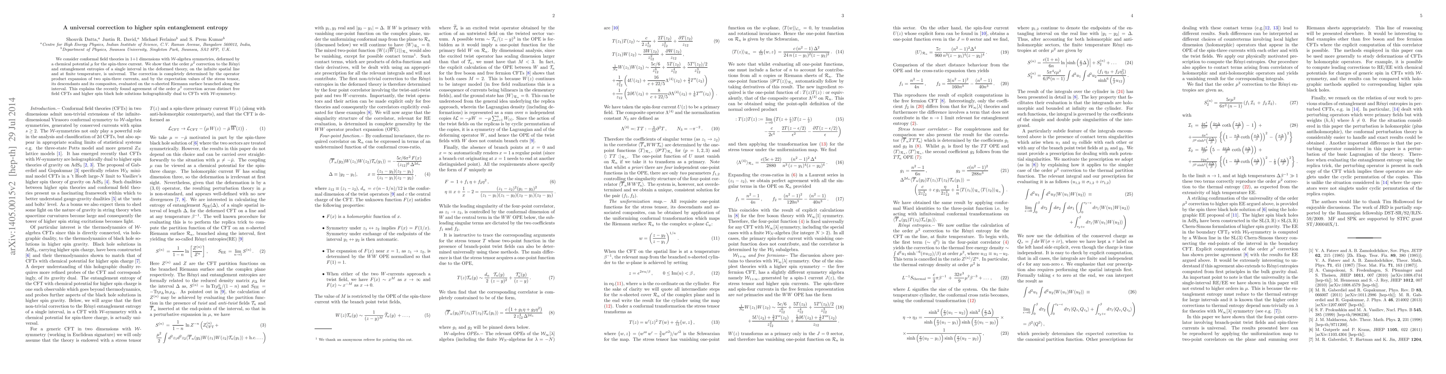 We consider conformal field theories in 1+1 dimensions with W-algebra symmetries, deformed by a chemical potential \mu for the spin-three current. We show that the order \mu^2 correction to the Re'nyi and entanglement entropies of a single interval in the deformed theory, on the infinite spatial line and at finite temperature, is universal. The correction is completely determined by the operator product expansion of two spin-three currents, and by the expectation values of the stress tensor, its descendants and its composites, evaluated on the n-sheeted Riemann surface branched along the interval. This explains the recently found agreement of the order \mu^2 correction across distinct free field CFTs and higher spin black hole solutions holographically dual to CFTs with W-symmetry.